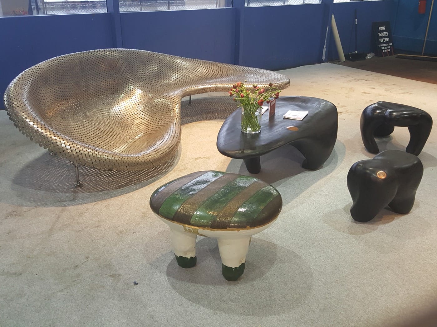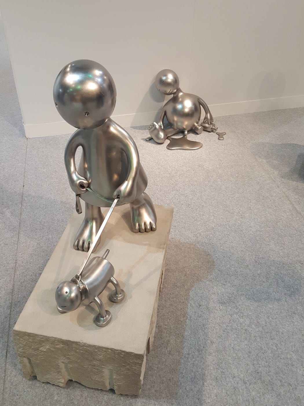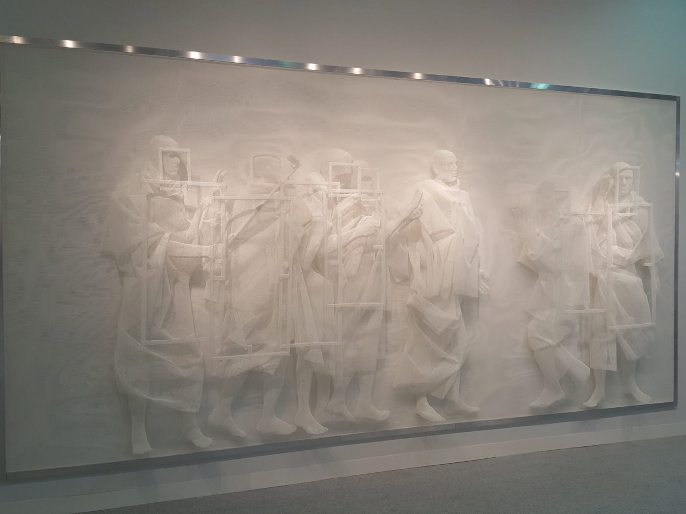 Among my favorites were the Tom Otterness sculptures in Marlborough Gallery‘s booth and a wonderful, frieze-like sculpture, “Untitled” (2017), made of “thermoshaped plastic mesh” by the Recycle Group, on view in the booth of Paris’s Suzanne Tarasieve gallery. Sprüth Magers knocked me back a few feet with their massive piece by Michail Pirgelis, “Diver” (2016), which consisted of part of the wing of an airplane. It’s an old trick to go big with an object that has utilitarian functions, but it still works now and then. As I said, big and electric, this fair.