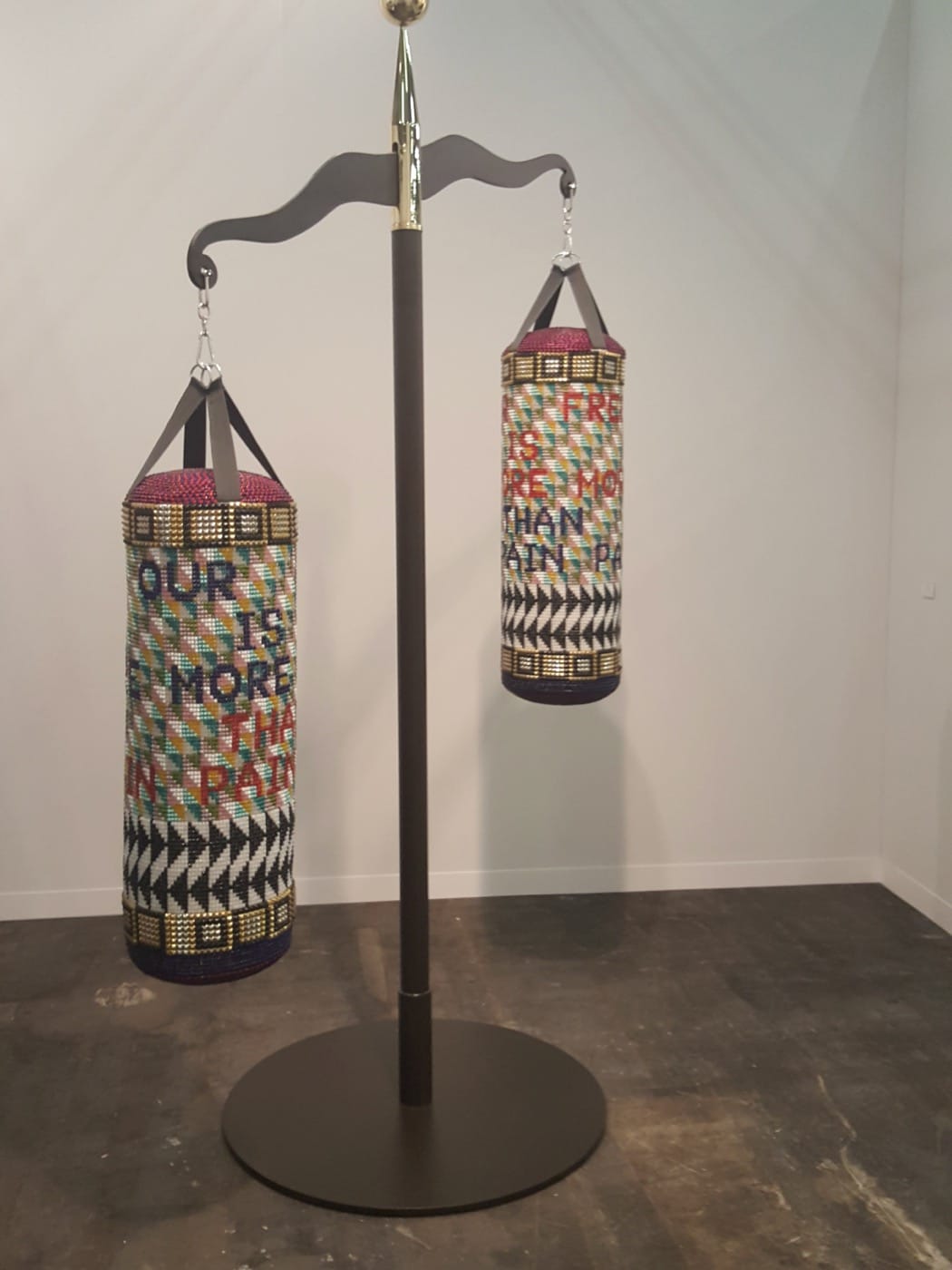 I was happy to run into Alma Thomas‘s “Apollo 12 ‘Splash Down’” (1970) in the Michael Rosenfeld Gallery booth, and was even happier to see a booth full of Jacob Lawrence’s work at Jonathan Boos. I have a lot of affection for Jeffrey Gibson’s heavy bags, and his “Our Freedom is Worth More than Our Pain” (2017) keeps both the pugilistic purpose of the work balanced with the decorative filigree of the bead work he has added to the bags.