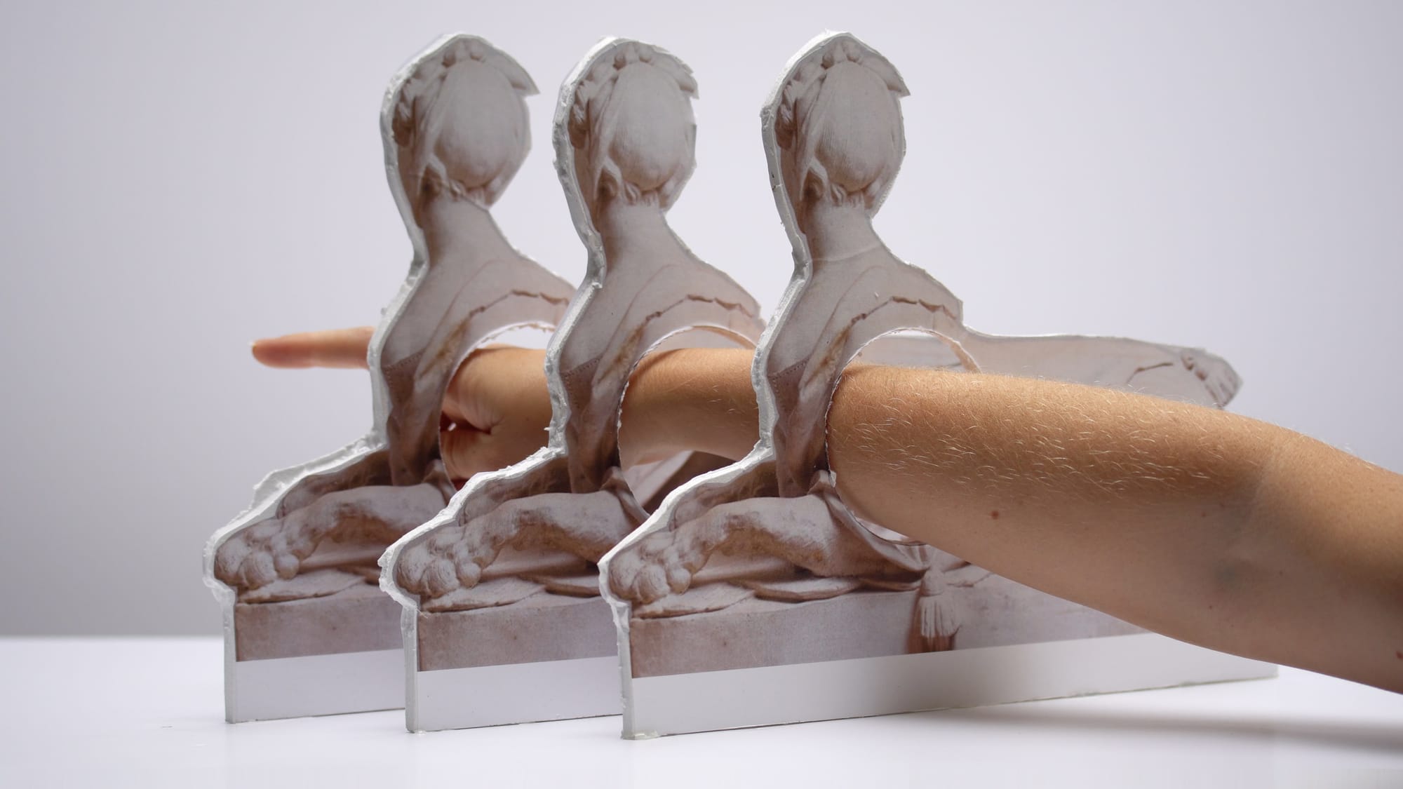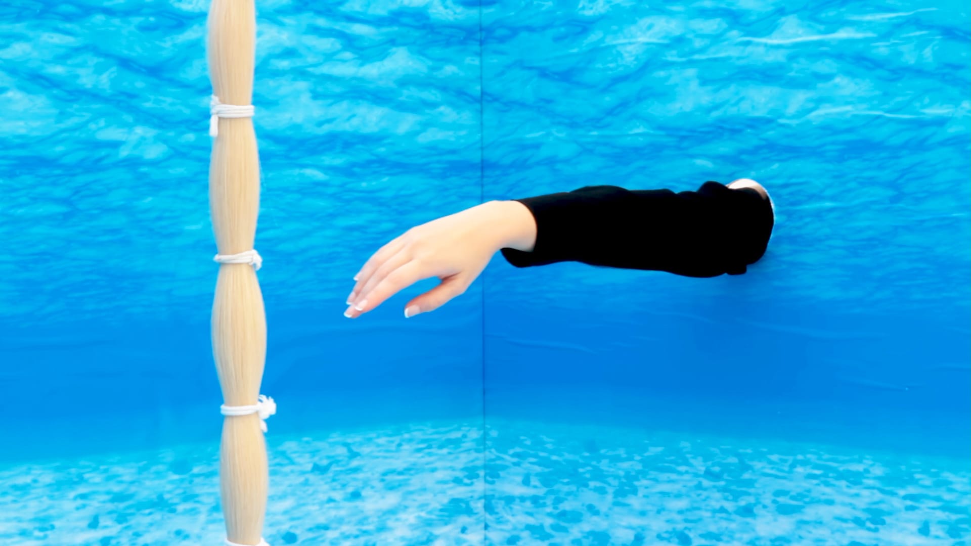 VLM is a woman who knows how to drill — literally, a Dewalt power tool in her pale, French-manicured hand. In DEEP SEE(2017), the drill ruptures a 2-D seascape, a black-sleeved forearm entering to grasp at a human ponytail. In PONY HOTEL (2018) shots of a sunny business suite are ruptured by close-ups of a silver bit suddenly entering a void. CUT COPY SPHINX (2018) montages one drill shot after another — each hole a possible frame for the artist’s own curious face. In Beyond Means (2017), pennies spin across a white surface, the sound of a drill whirring in the background. As a portal forms in a wall, a clear, gelatinous substance oozes from its edges, the artist’s by-now familiar hand invading to the sound of dripping water.
