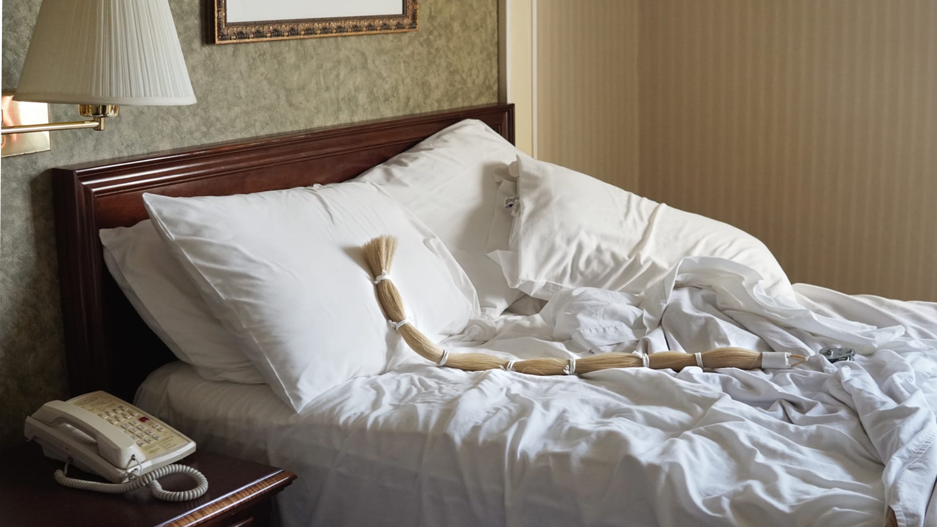A blonde ponytail waits alone on an unmade bed. A drilled hole in a blue box reveals a blinking eye. Pliers snap a wire hanger, the hanger’s corner trembling to the sound of windchimes. A cheese Danish is slowly punctured by a prim pointer finger.