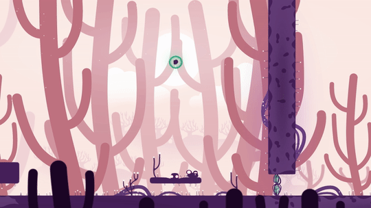 Not much of Rothko is left in the game — aside from a fairly minimal palette that shifts with each environment from swampy green to bright fuchsia. Yet it has a distinct aesthetic, from the atmospheric soundtrack to the layers of organic silhouettes that suggest simple but strange flora and fauna, which immerse players in this squishy world. In each of the levels, which are all accessible for you to bounce through from the beginning, you pick up a new skill, ultimately bringing them all together in the final stage. The goal is to collect a series of orbs that will eradicate an infection of hardness that is plaguing the soft biomes of Semblance, which, as its name suggests, is meant to be a place of changeable realities.