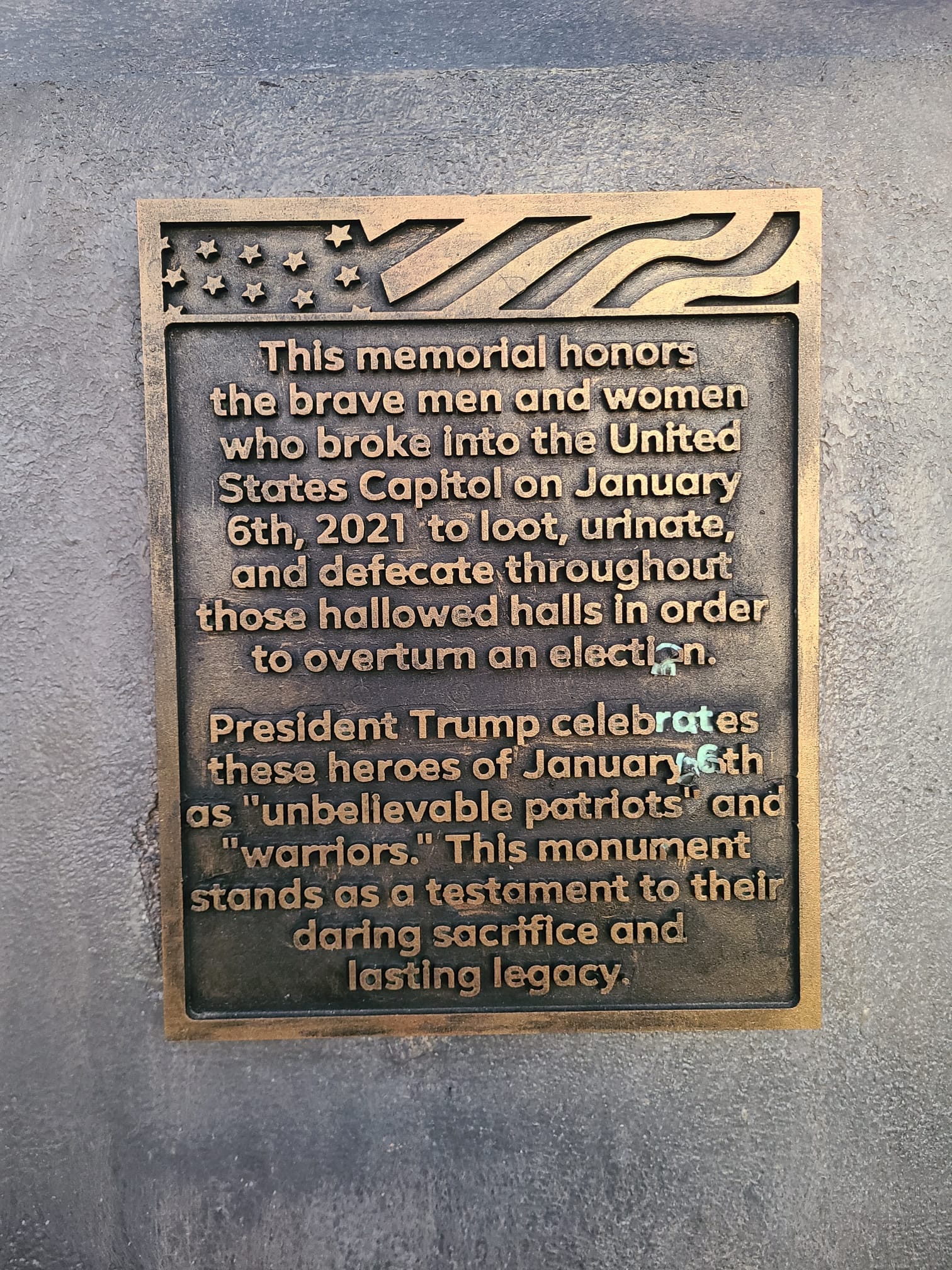 "This memorial honors the brave men and women who broke into the United States Capitol on January 6th, 2021, to loot, urinate, and defecate throughout these hallowed halls in order to overturn an election," reads an affixed bronze plaque.
