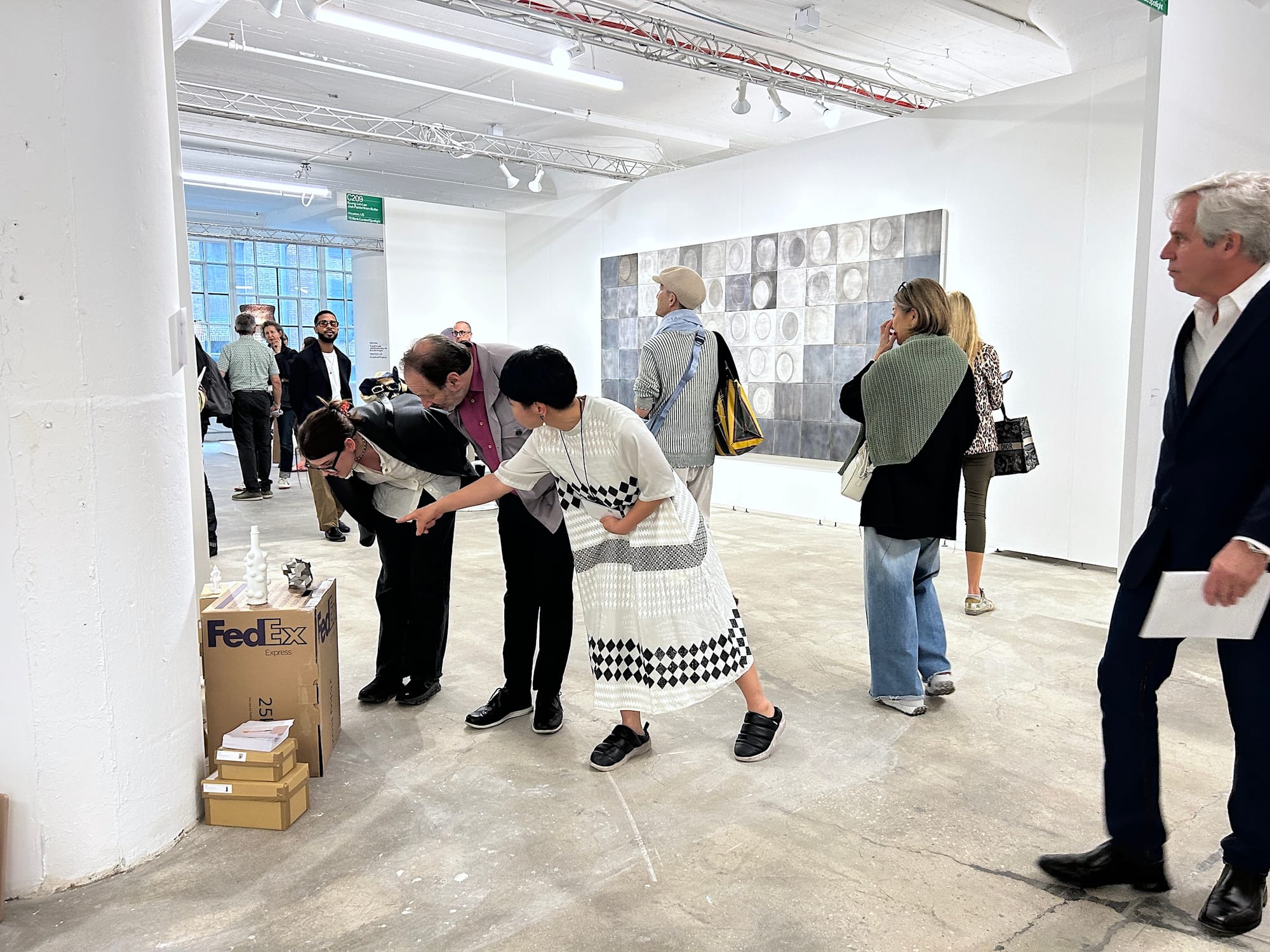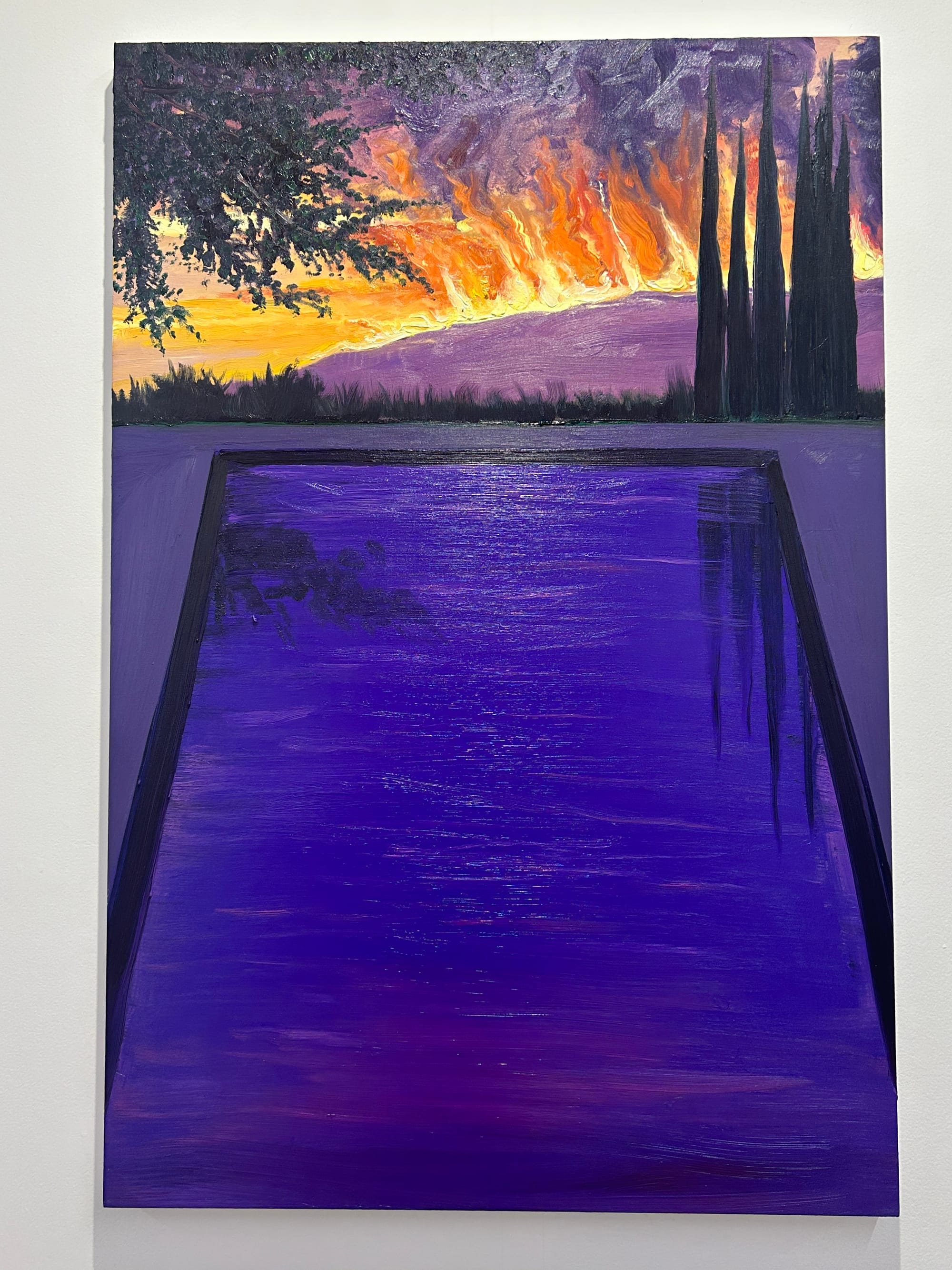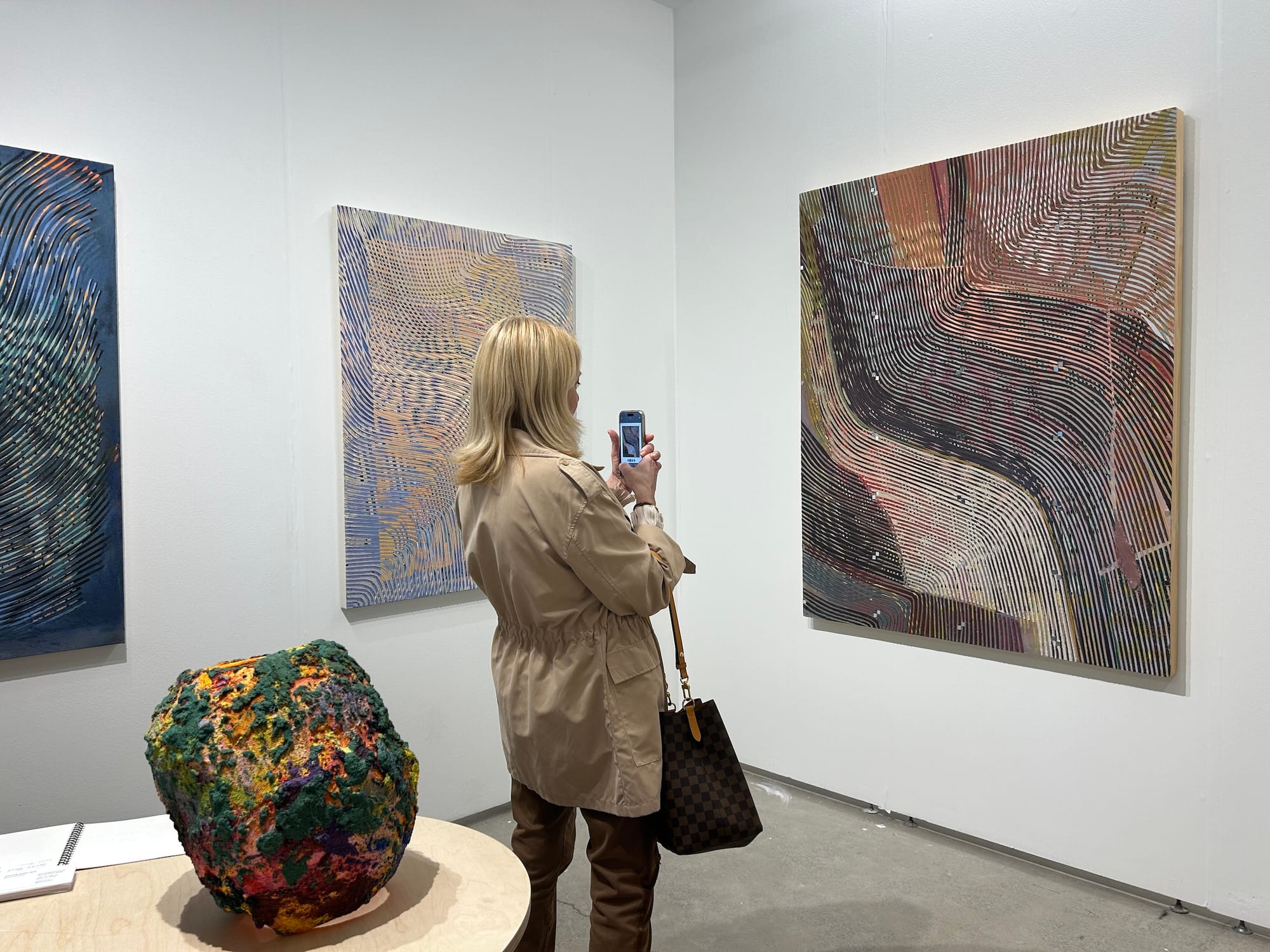 There were also plenty of people who were drawn to paintings, such as Cob gallery’s presentation of YaYa Yajie Liang’s fluid oil canvases and Salomón Huerta’s depiction of the Los Angeles fires, both of which attracted admiring visitors. Liliana Zavaleta, an artist and returning collector to NADA, showed me a work that she had put on hold: a blue and gray abstract oil painting by Jean-François Lauda at the booth of the Montreal gallery Eli Kerr. I asked her what drew her to it, and she told me it was just a “feeling.”