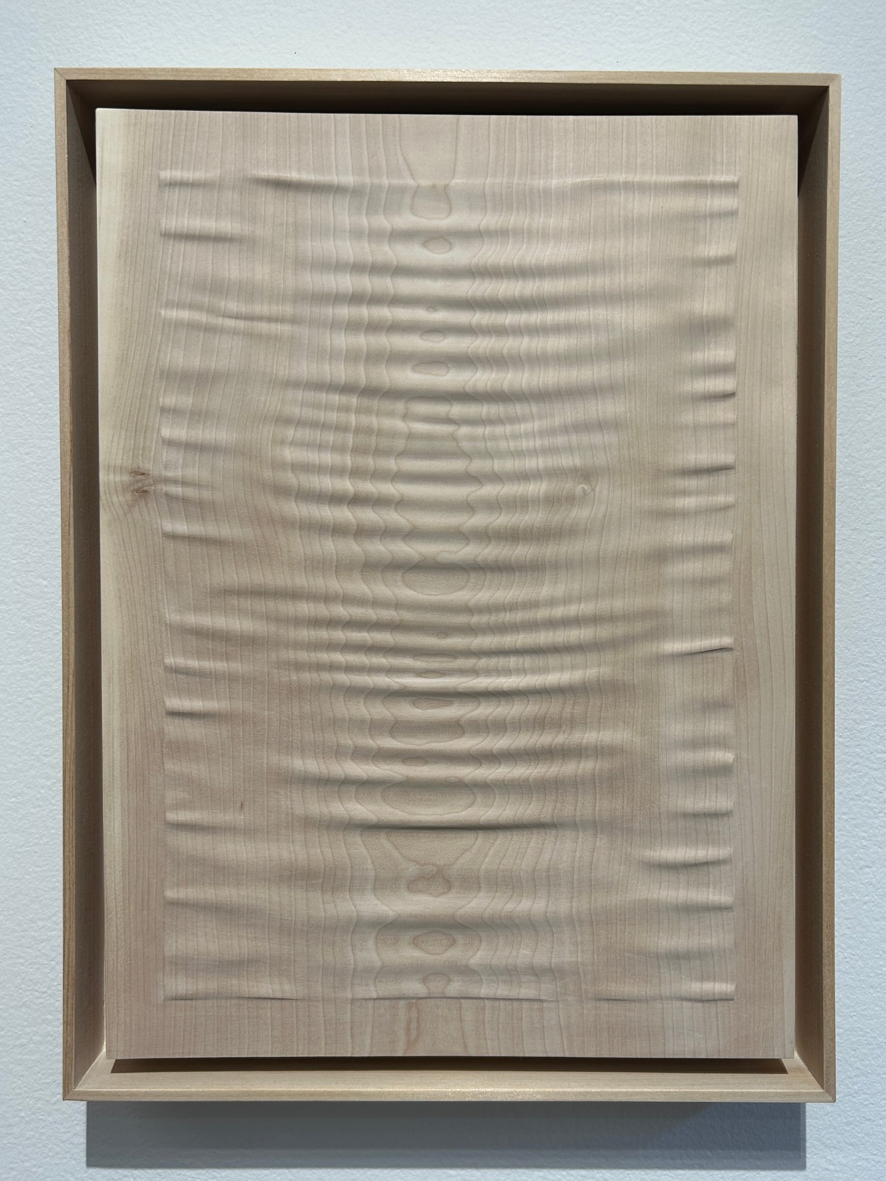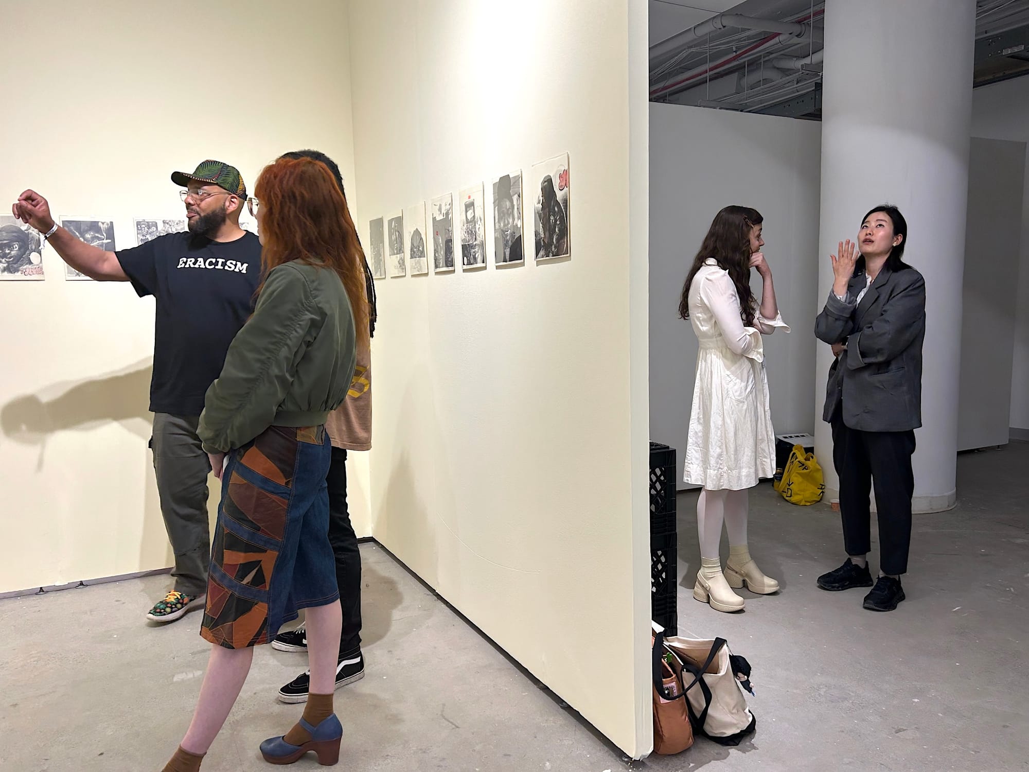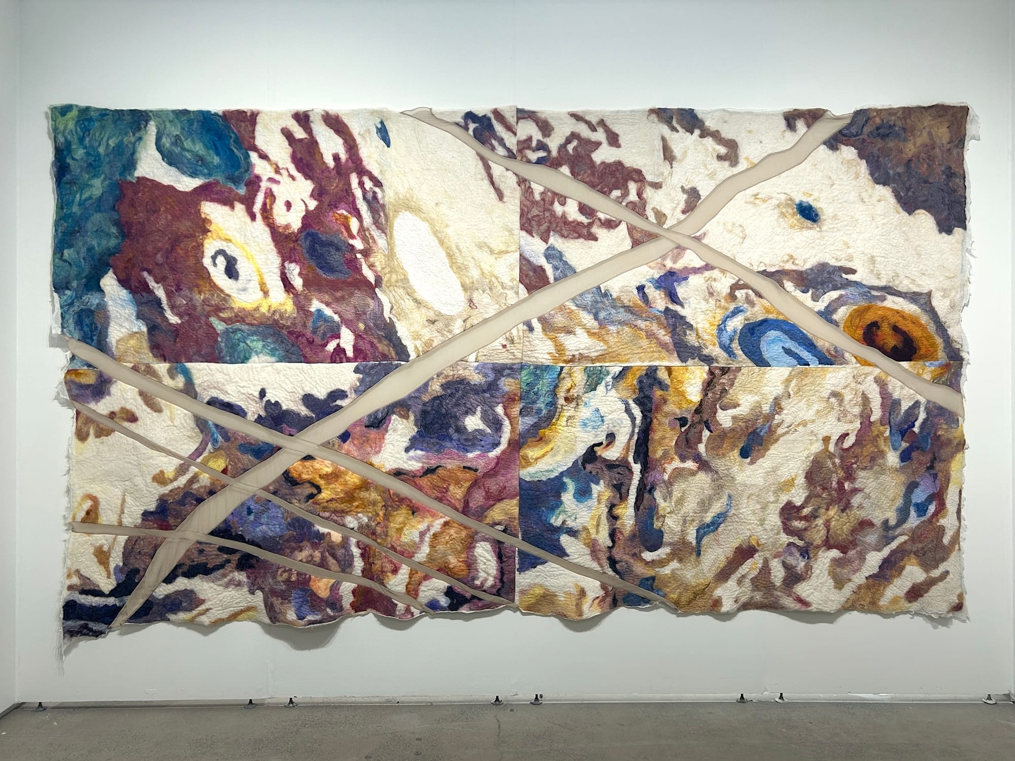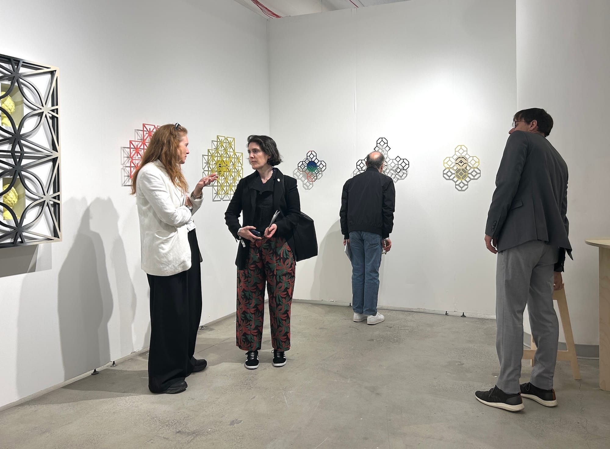 There were also plenty of people who were drawn to paintings, such as Cob gallery’s presentation of YaYa Yajie Liang’s fluid oil canvases and Salomón Huerta’s depiction of the Los Angeles fires, both of which attracted admiring visitors. Liliana Zavaleta, an artist and returning collector to NADA, showed me a work that she had put on hold: a blue and gray abstract oil painting by Jean-François Lauda at the booth of the Montreal gallery Eli Kerr. I asked her what drew her to it, and she told me it was just a “feeling.”