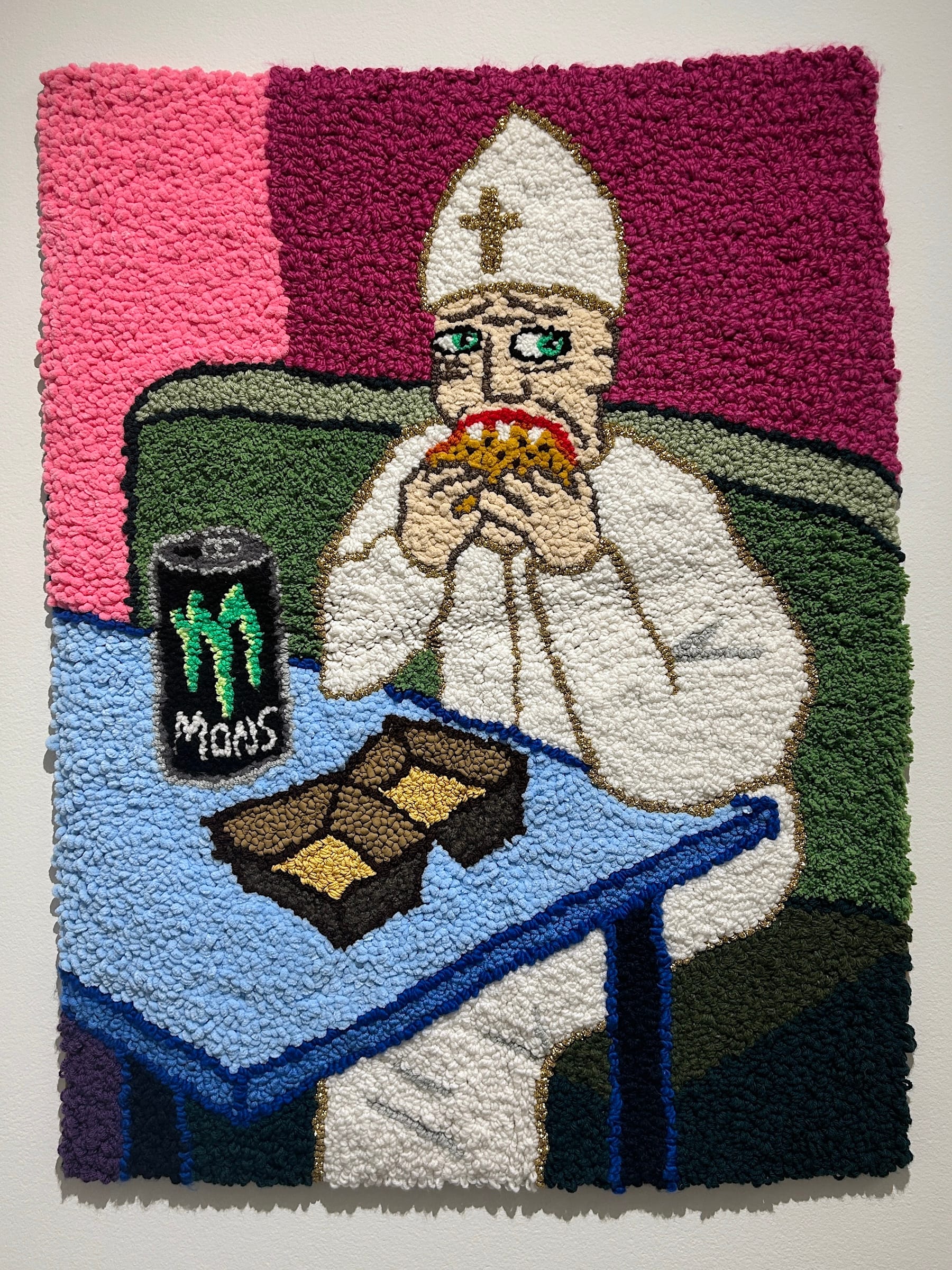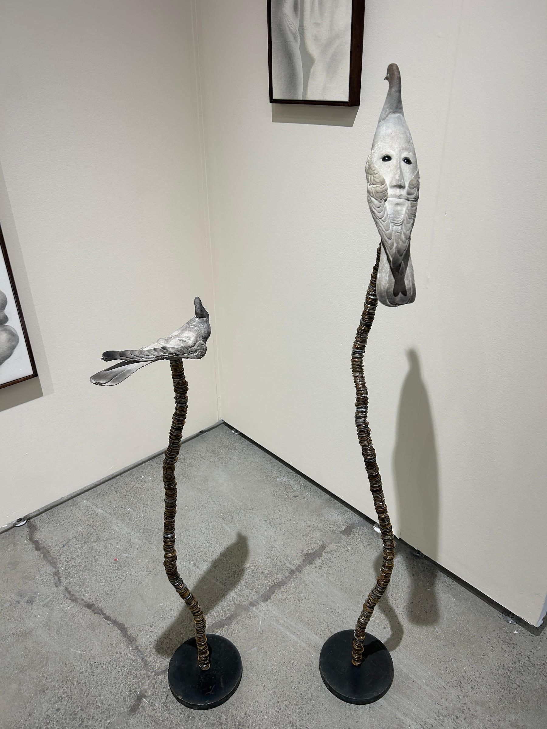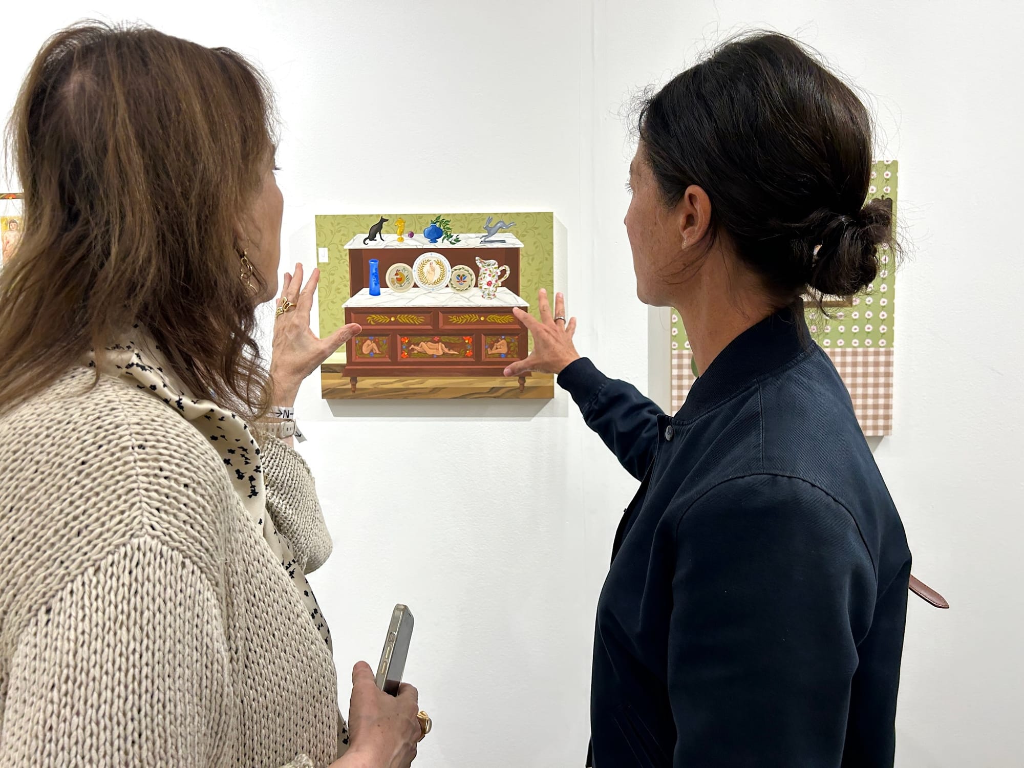 Many booths were teeming with textured sculptures, such as Ernesto Solana’s aluminum and bronze depictions of birds and flowers at Guadalajara90210, SaraNoa Mark’s intricately carved clay works at Goldfinch, and Anna Yamanishi's fabric-like wood carvings at Cohju gallery. At the booth of Pasto gallery in Buenos Aires, faces carved onto concrete pigeons teetering on coin stilts caught the attention of a couple, who told me that they were a bit “bored” by all the painting at the fair. The sculptures by Argentinian artist Santiago Licata were listed for $6,000, the gallerist told me — a recurring price point across NADA this year. The works had not yet sold, but another work by Licata had been snatched up for $3,000.