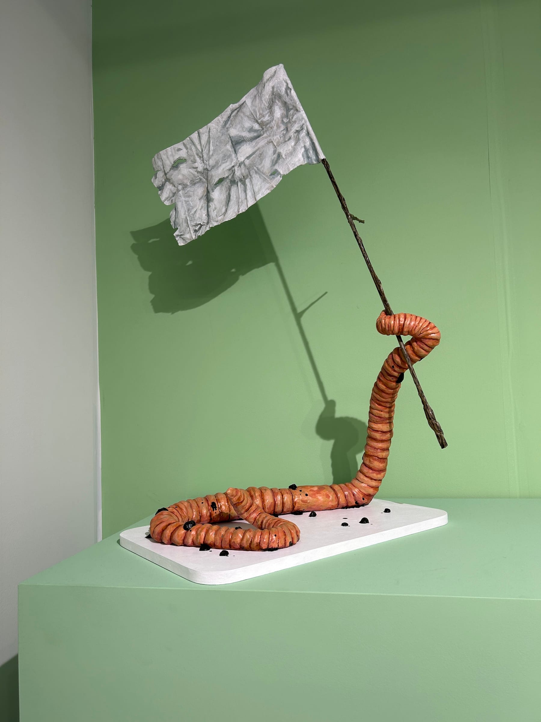 After stumbling across the arthropods, I found that Tatjana Pieters gallery’s booth had an entire flock of taxidermied crustaceans emerging from assorted objects including a snake coil, a severed dog head, and a spiked sunburst staged around a folklorish house display. They were created by Belgian artist Charles Degeyter, who told me that the series draws from his childhood in Southern France. NADA has a reputation for showcasing rising artists and up-and-coming trends, but it still surprised me to find another whimsical animal sculpture display at Massey Klein Gallery’s booth, where tiers of upright fish, a supersized worm, a lobster, and birds created by Canadian visual artist Jude Griebel warned passersby of impending doom due to human activity.