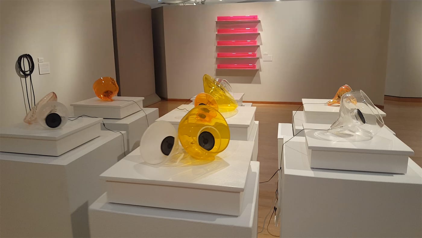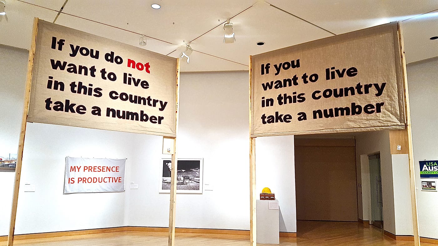 Does this matter? Not really. With a theme that places such focus on the social impact of sculpture, it stands to reason that the defining aspects of sculpture might be stretched to include, for example, sound sculpture, as with Susan Byrnes’s “Epiphany” — a subset of a larger work called “Discover;” direct political action, as with “RUN,” a collection of souvenirs from the 2017 mayoral campaign of Erie, Pennsylvania-based “social sculptor” Lisa Austin; and “Survey,” the lo-tech survey apparatus by Micaela de Vivero, which keeps tally by inviting visitors to take a number from two opposing signs, in this case one that instructs “If you want to live in this country take a number” or “If you do not want to live in this country take a number.” These were all part of the group show, Igniting Change, which ran at BGSU’s Dorothy Uber Bryan Gallery during the symposium and core weekend for Sculpture X.