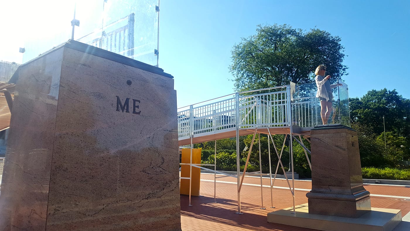This is a playful kind of social practice art, and certainly employs some of the artist’s signature moves: Chin’s work often leverages symmetry and is often extremely literal. It is also inarguably an interactive sculptural work. But whether it can be judged aesthetically as a sculpture is difficult to say. The ramps by which participants approach the platforms are visually distracting to the actual presentation point of pedestals. The glass walls atop the pedestals interfere with the finished effect, which would be more like the thing it emulates without them. Presumably, the artist has made these choices to accommodate considerations of safety and inclusion; the ramp makes these terminal points handicapped-accessible, where the more visually discreet direct-approach of a staircase would not, and the glass walls hedge against the possibility that any of these works of living statuary slip from the pedestal (statues, after all, seem to accept loss of limb with magnanimity; museum-goers are rather more likely to sue).