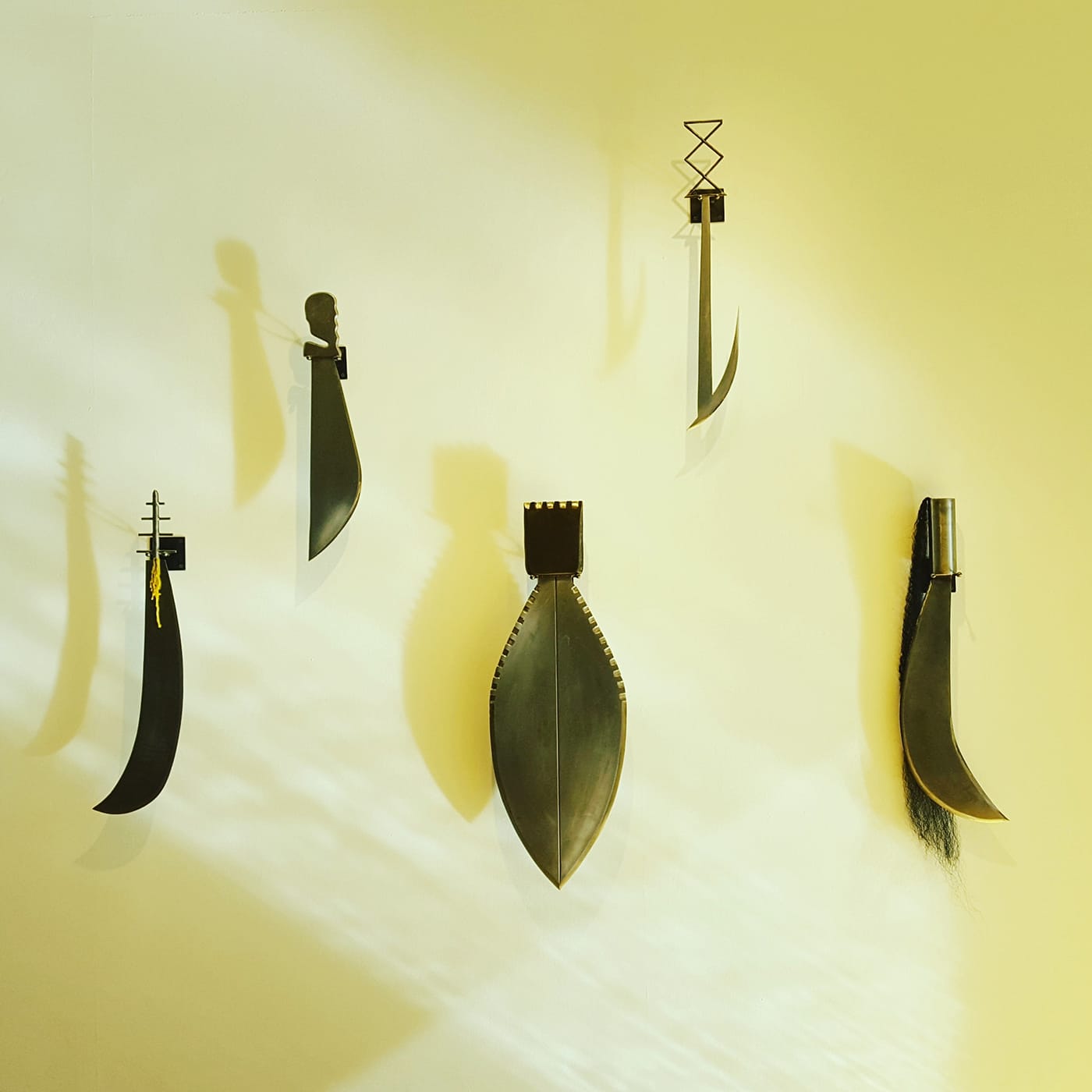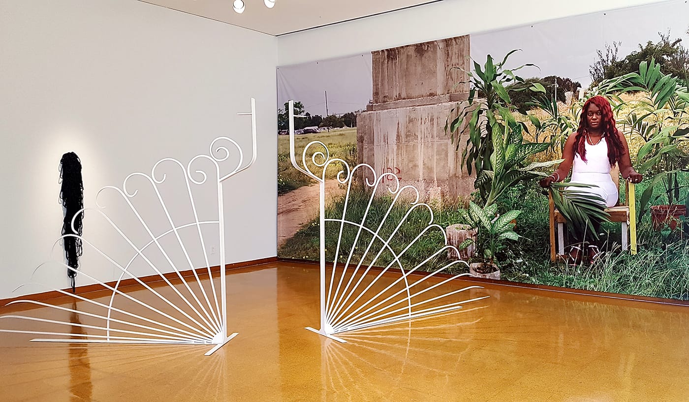 Of course, SculptureX presented numerous works that are both uncompromised in their conceptual underpinnings and conventional, in terms of their sculpture-ness. But even the less interactive exhibitions presented artists very much at play with the idea of building an alternative sculptural relationship with real-world space. A solo show, Soft Thrones: Sites of Power, by intermedia artist Jova Lynne, presented a series of photographic portraits in juxtaposition with a series of objects — machetes — that were inspired by the portrait subjects. The portraits were taken in Lynne’s ancestral homeland of Jamaica, and feature five female-identified queer Jamaicans of the artist’s acquaintance, posed variously in seated positions against a background of lush jungle. Working from these portraits, Lynne then created five machetes to correlate with her subjects, and the whole assortment is presented in a gallery dominated by a wall-sized blow-up of one portraits, “Soft Throne” (2018), and punctuated by a freestanding piece of decorative iron fencing, “Thresh(Hold)” (2018). Where is the sculpture, here? At least half the works are photographs, and the only freestanding item is a piece of fencing, presumably prefabricated. The five machetes can be argued as sculpture, but the artist also specifically classifies them as weapons; it is unclear whether an art historian might characterize these as a more vernacular kind of artwork, as is the case with ornate scrimshaw carvings on the handles of pocketknives, for example.