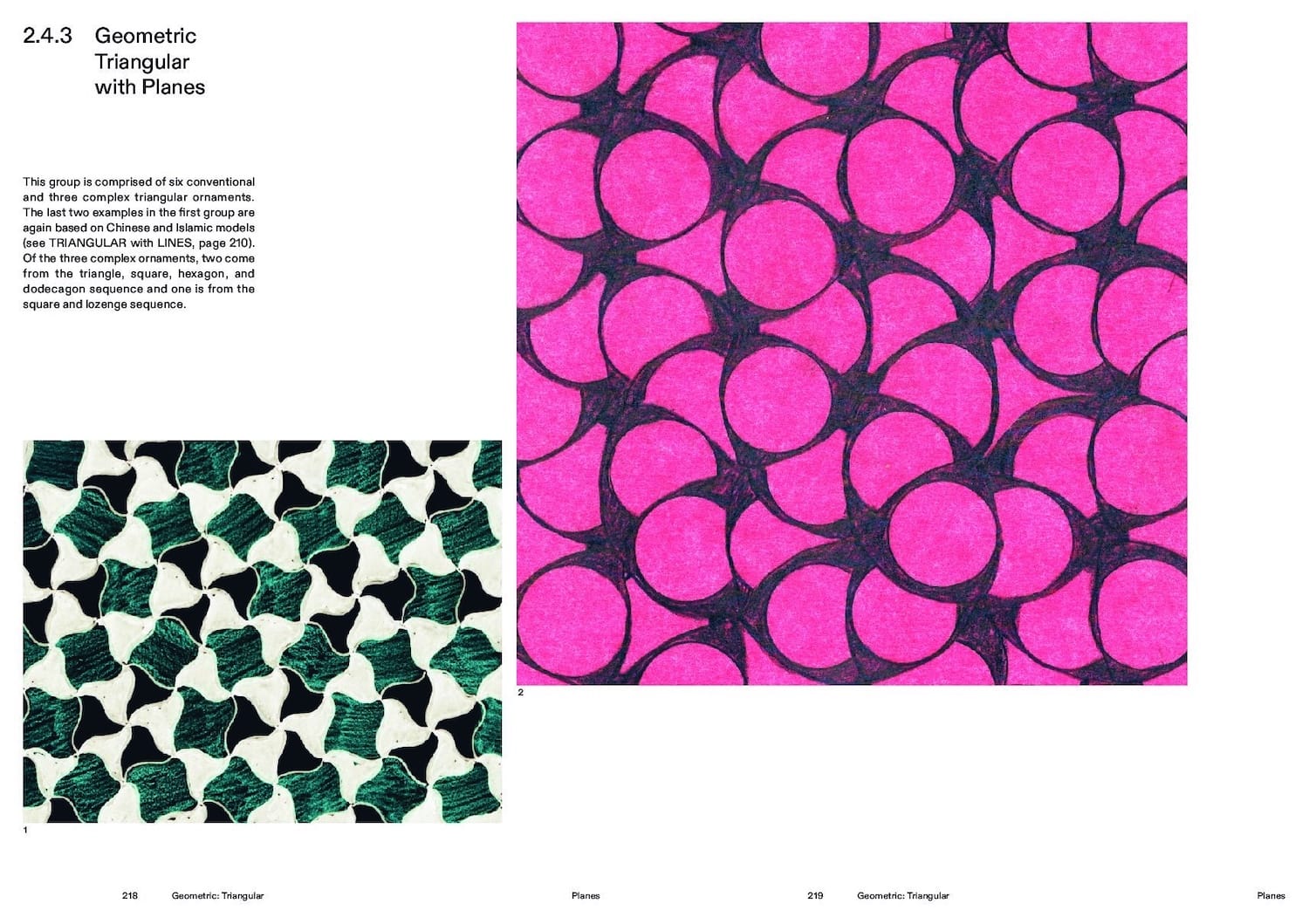 Rather than categorize ornamental patterns by region, Weil’s New Grammar offers a taxonomy of forms: minimal, geometric, and floral. And instead of copying extant patterns, as Jones did, Weil presents stylistic experiments through his own artwork. These experiments are immensely valuable as they offer designers tools to push the bounds of surface design with thought exercises of line and form. Colorful, playful, and bold, his personal explorations are bookended by academic analyses of the history of ornament, by Weil as well as Manuel Will and Heinz Schütz.