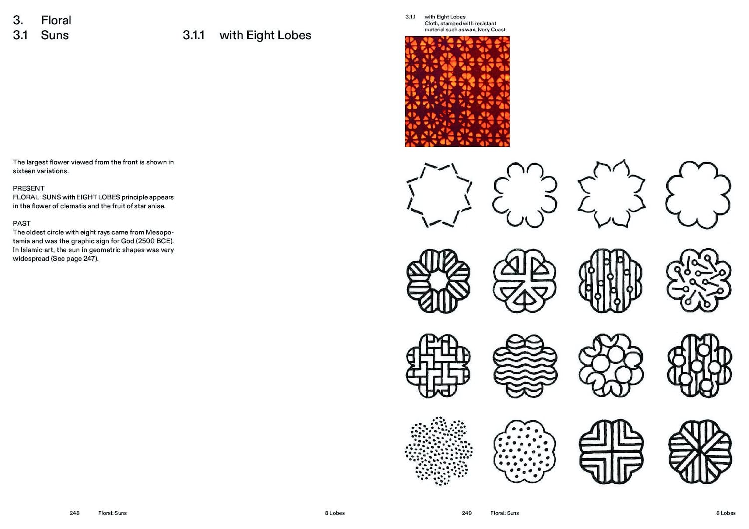 Weil includes references to some symbolic motifs, as well as photographs of historical ornamental patterns, which his criteria for choosing are “the options for an open order, for varied readings, and the author’s practice-trained conscience as an artist.” These photographs are most common in the last chapter, “FLORAL,” which presents symbolic motifs divided into four themes: “Suns,” “Plants,” “Archetypes,” and “Earth.” These acknowledgements of ancient Greek spirals as defensive magic serve to underpin contemporary, non-symbolic ornamentation. He distinguishes newer pattern designs under headings marked “PRESENT,” while meaning-rich motifs in folk art, even with all of its contemporary practitioners, are relegated to the “PAST.”
