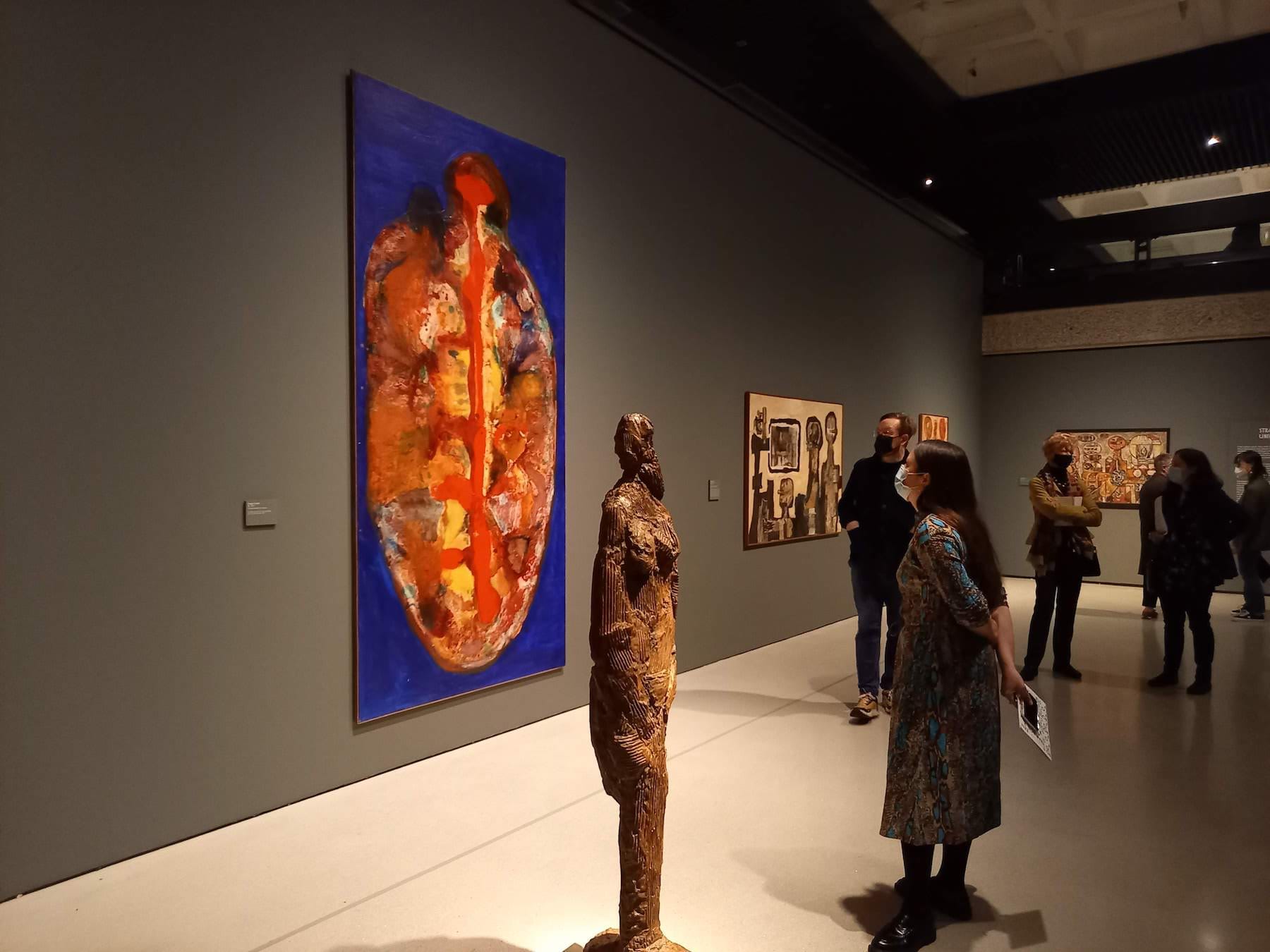 Postwar Modern’s main arena, entitled Strange Universe, particularly stands out. The section explores the visual weirdness and technical extremes artists employed to express their ideas. The human body is reduced to abstraction, or to its basic essence. As Alison notes, “disfiguration is [the artist’s] strength,” and humanity is stripped back to its fundamentals. Paolozzi’s bronze men are a gleaming organized chaos of limbs; Peter King’s "Head of a Woman" (1957) is composed of melting globlets of Ciment fondu. Giant, amoeba-like works of brilliant, weeping color by Magda Cordell are a revelation, combining the immiscible acrylic and oil mediums on Masonite in works such as in "Figure 59" (c. 1958), and the wild, Dubuffet-like impasto of Franciszka Themerson’s landscapes (for instance, “Topography of Aloneness,” 1962). The overarching impression here is one of positivity — the desire to explore a complexity of feeling following war’s devastation by experimenting with new ways of creating. This explosion of technical ambition and the ambition to redefine the human form suggest a desire for progress in both art and society.