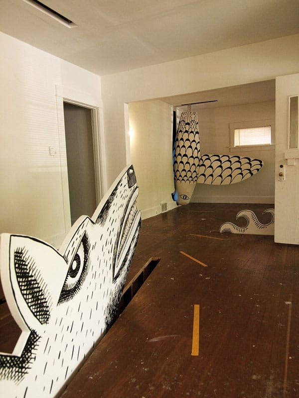 In stark contrast, Mad Homes, an installation by the Non Profit Mad Art in Seattle is a relatively lo-fi, community approach to public installation. The exhibition is open until this Sunday, August 7 and takes place in and around three soon to be demolished houses in the suburban residential neighborhood of the city’s Capitol Hill. Fourteen local artists were invited to descend upon the houses, which are being demolished to make room for condos by development company Point 32.