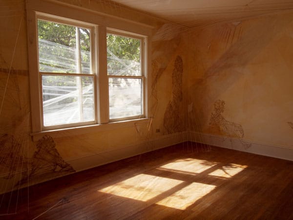 Artist Troy Gua has wrapped on of the houses entirely in Saran Wrap. The large faux bar code stuck to the back of the house gives it that all too familiar twinge of bitter sweet nostalgia associated with moving. Next door the collective SuttonBeresCuller has created an expansive kinetic drawing using thousands of feet of red plastic straps. Their straps cling with determination joining two of the buildings in a ramshackle embrace. Inside, the resulting maze of red appears both exciting and claustrophobic. Allyce Wood’s three-dimensional yarn drawings of ghost like previous residents feel peaceful if not downright melancholy in comparison.