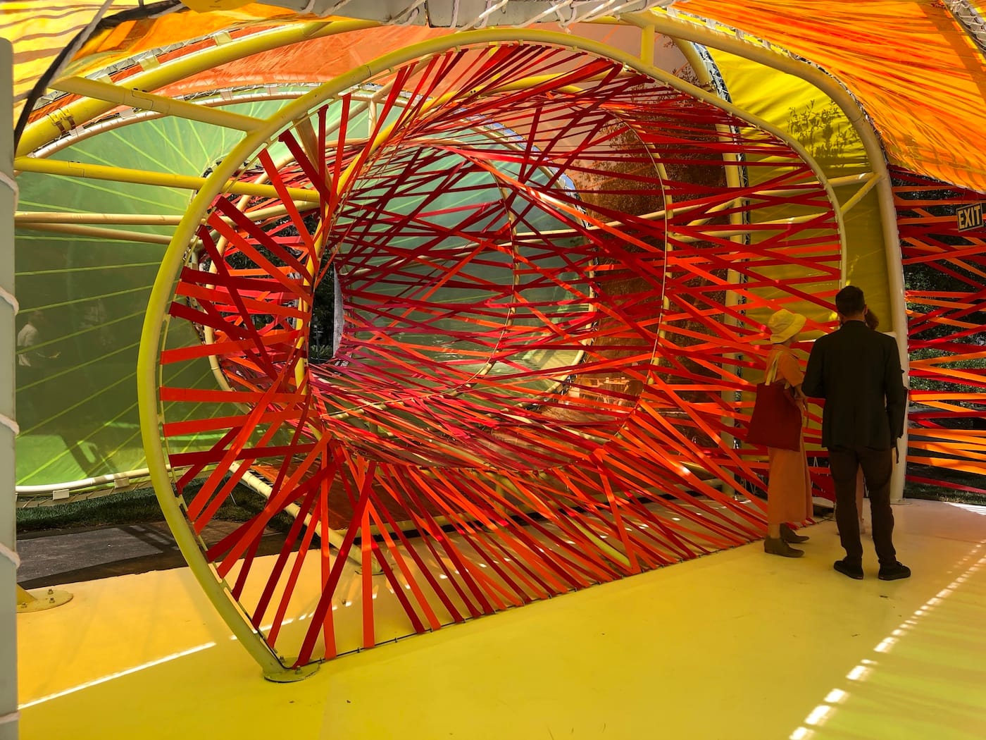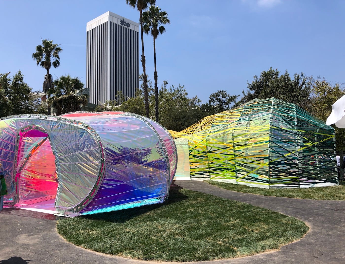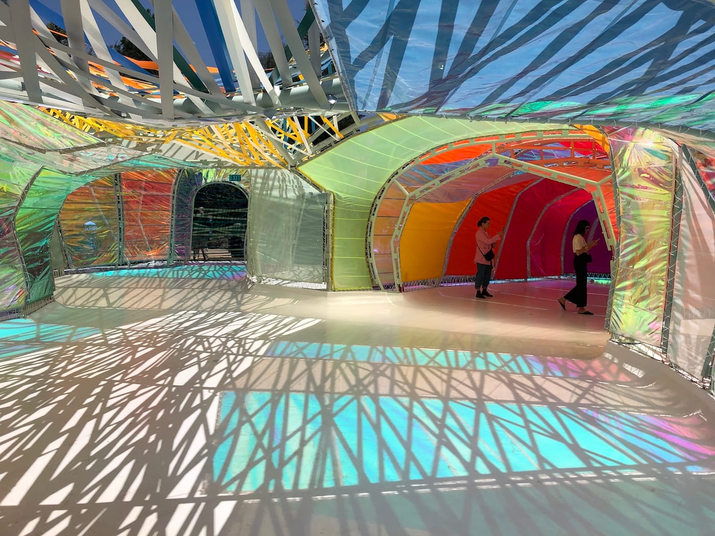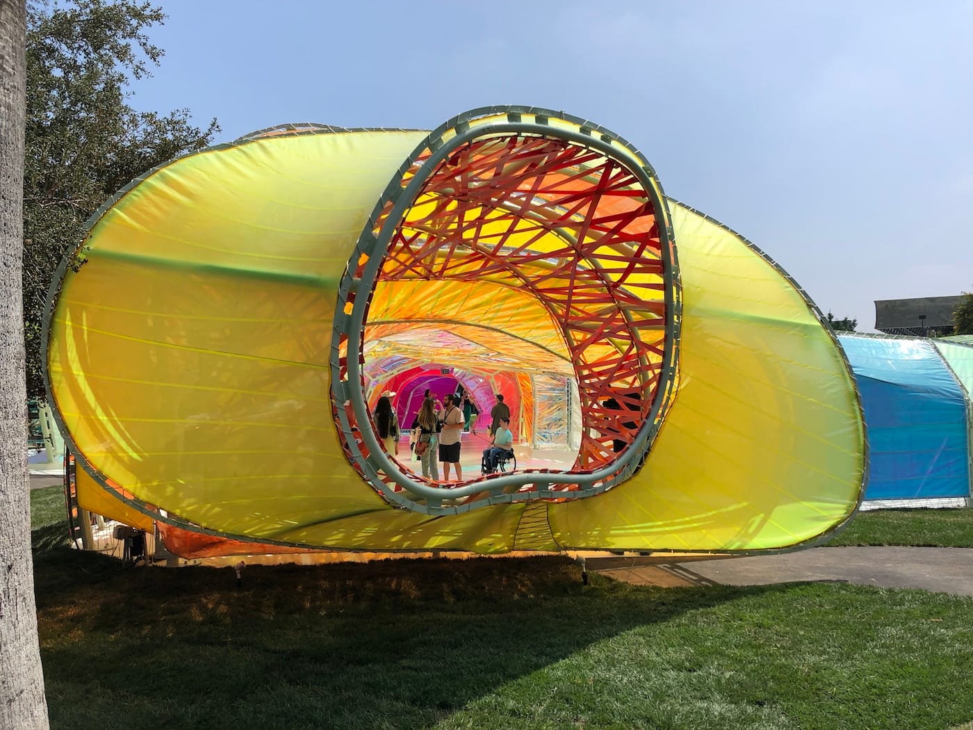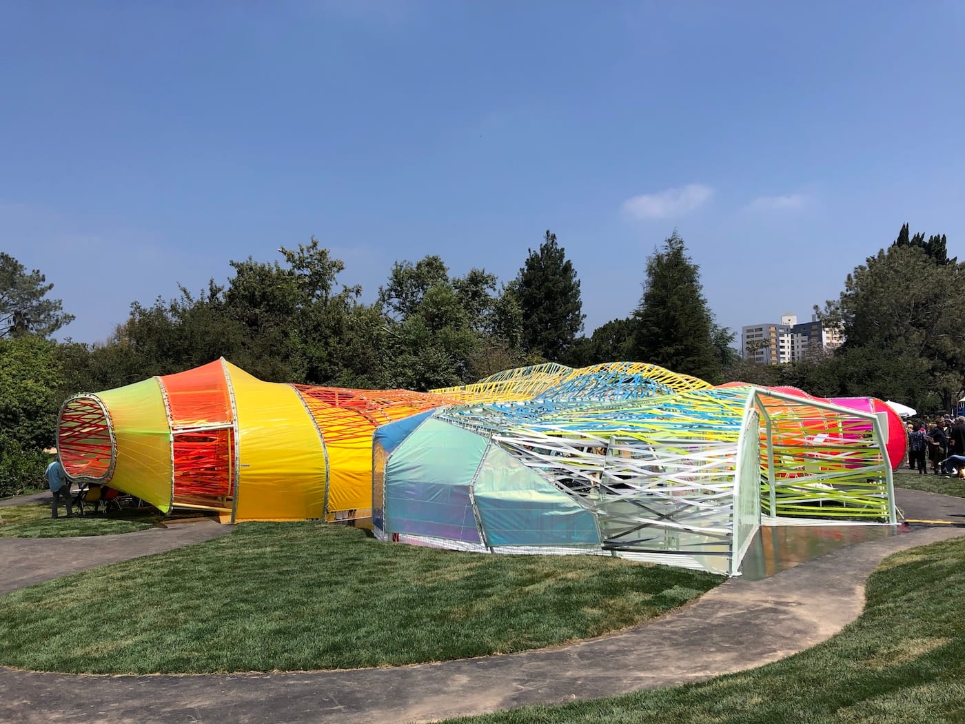 LOS ANGELES — This past June, a brightly colored, undulating blob appeared next to the La Brea Tar Pits off Wilshire Boulevard. This was no archaeological specimen, but an architectural pop-up created by Madrid-based firm SelgasCano. Made of stretched sheets and ribbons of shimmering, translucent plastic, the 866-square-foot structure resembled the love child of a ’90s raver and a wind sock. This is not to say that the experience of being inside its tunnel-like arms is unpleasant. Sunlight passing through the facade creates a kaleidoscopic effect similar to stained glass. At night, it’s lit from within and glows like a psychedelic jellyfish. However, its synthetic presence feels at odds with the black tar bubbling up from the ground nearby, like an alien spacecraft crash landed in the Pleistocene. This is perhaps because it was not made with the tar pits in mind at all, but was originally created as the 2015 Serpentine Pavilion, the renowned UK architectural commission which allows architects to create temporary, experimental projects.