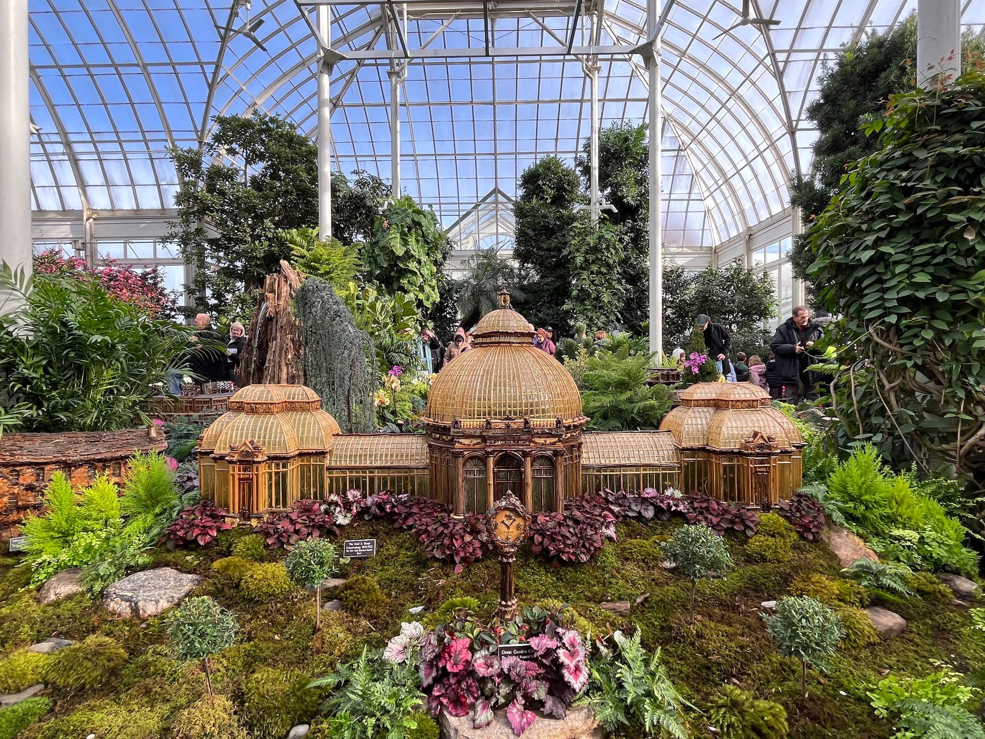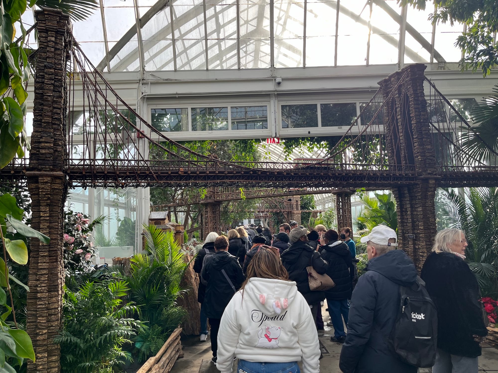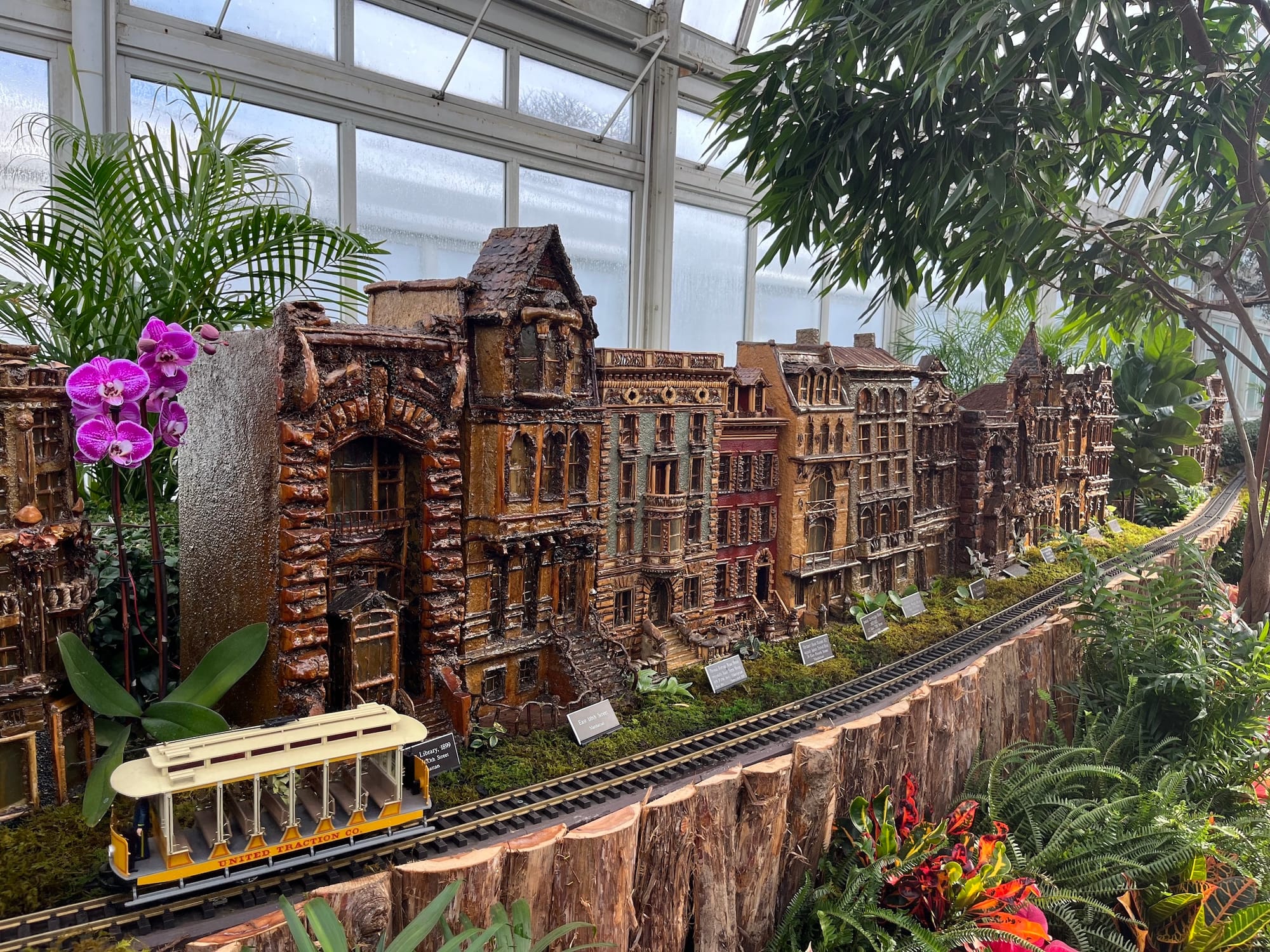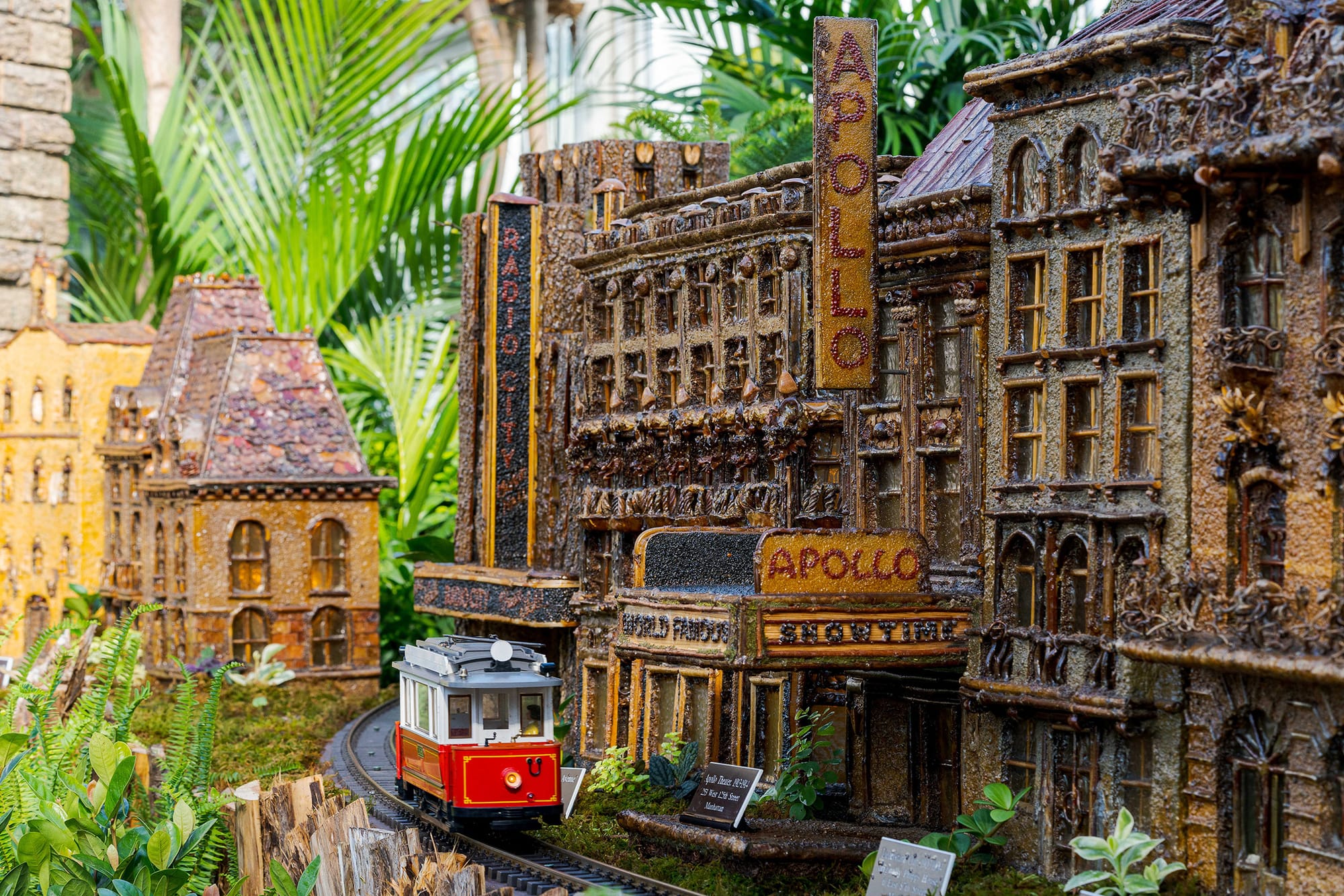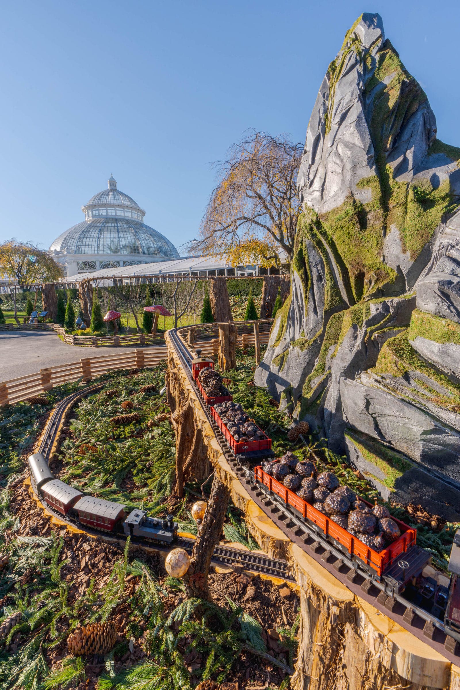 Inside the New York Botanical Garden's (NYBG) Enid A. Haupt Conservatory, a miniature Guggenheim Museum sports a mushroom-cap roof, the Statue of Liberty is made of palm fronds, and the Brooklyn Bridge is supported by a dizzyingly intricate arrangement of tiny twigs. The scaled-down landmarks are just a few of the nearly 200 NYC buildings constructed using natural materials at NYBG's annual Holiday Train Show, where around 20 doll-size conductors barrel and weave over a half-mile of track.