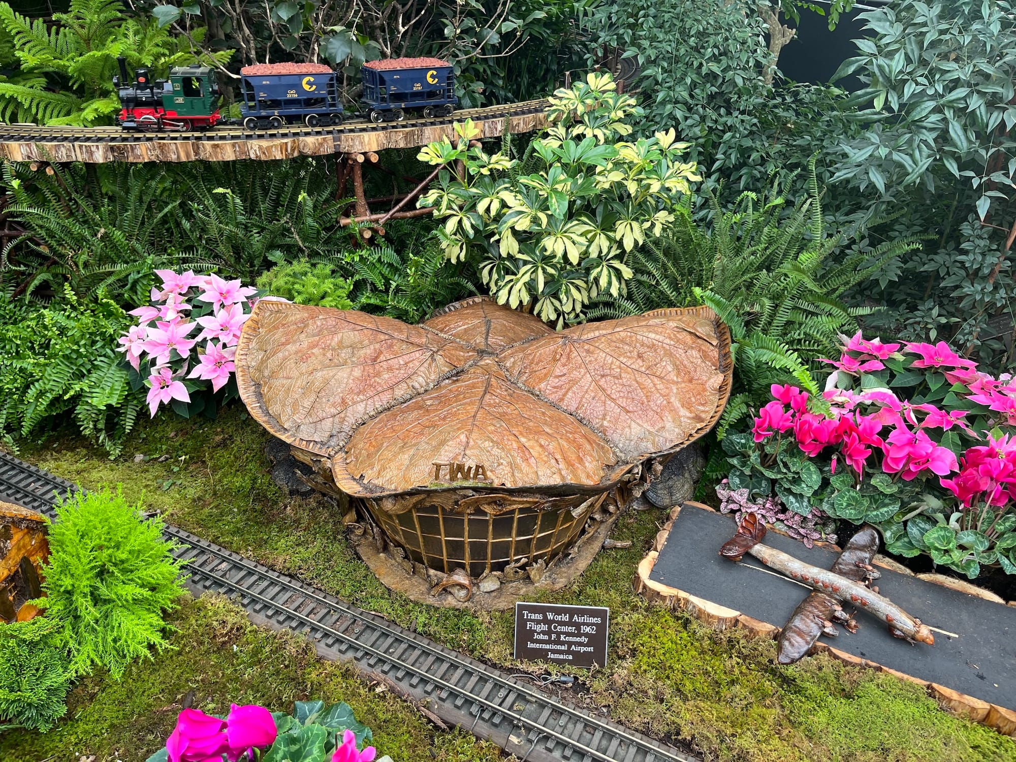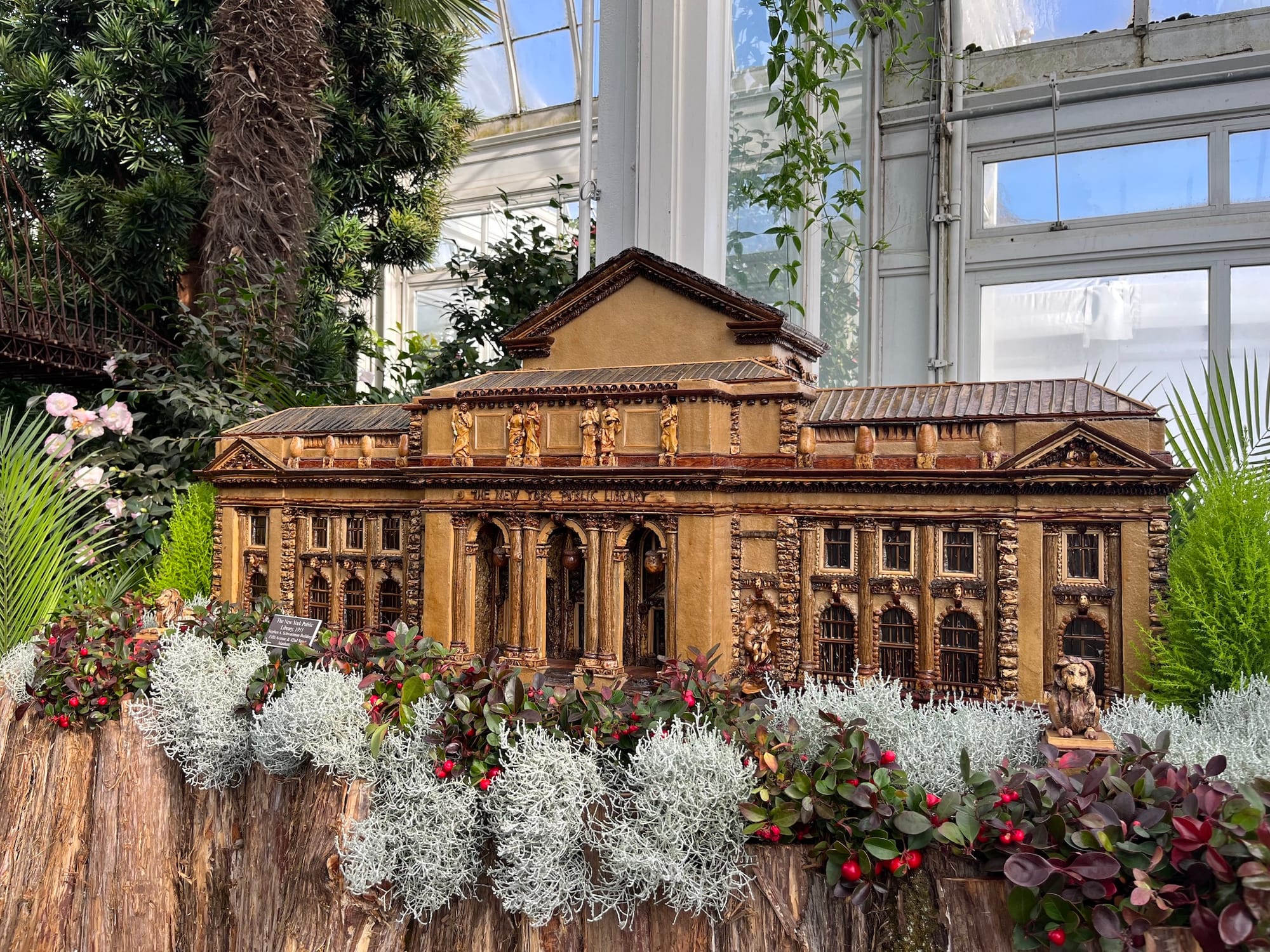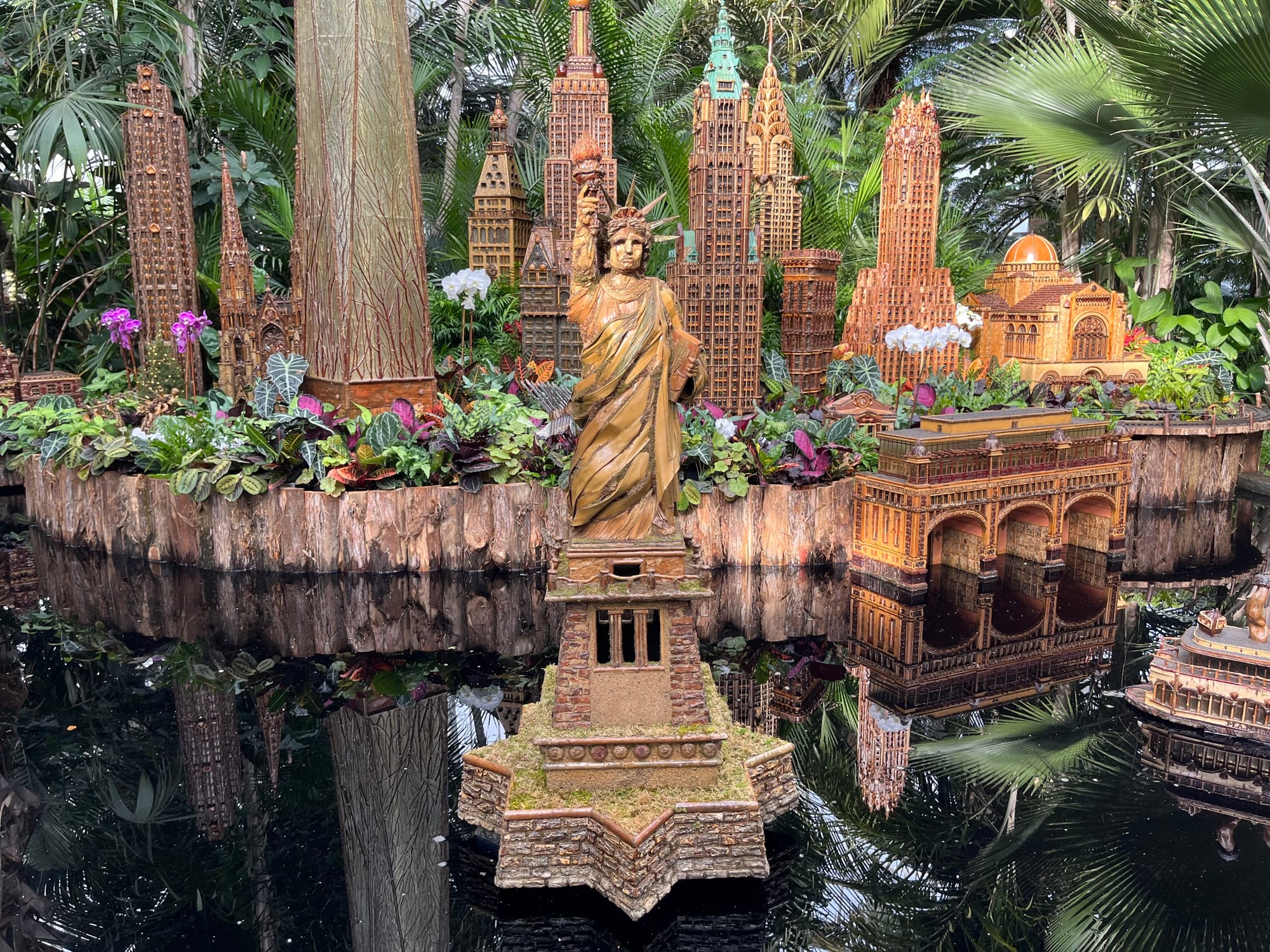 The grand finale can be found in the conservatory pond room. City landmarks like the Statue of Liberty, the Empire State Building, the Staten Island Ferry, the Plaza Hotel, and even the Oculus float on the stagnant water and line the stone fountain.