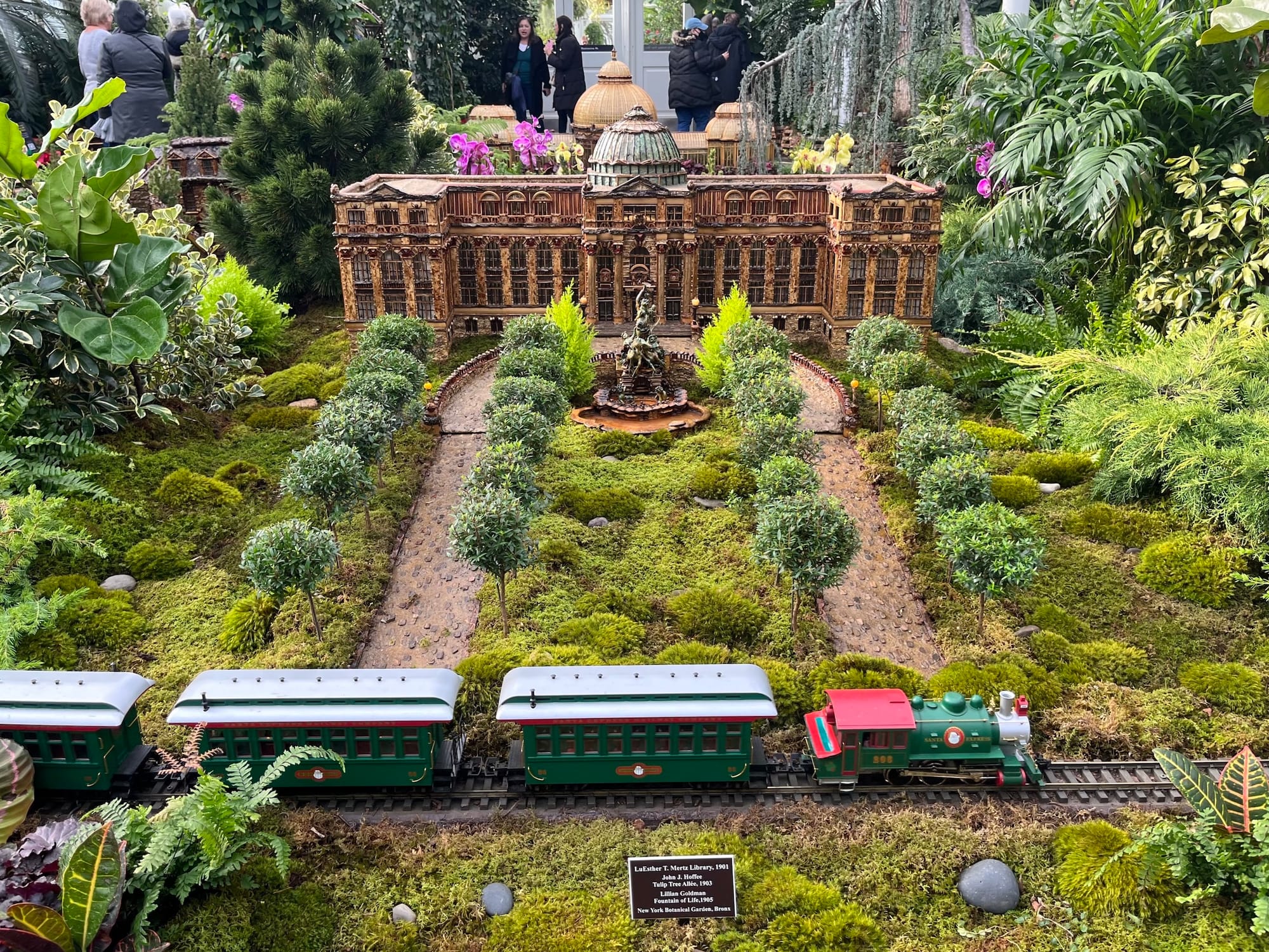 Laura Busse Dolan runs the Applied Imagination company that creates the structures in the exhibition. Dolan's father, Paul Busse, founded Applied Imagination in 1991, and a year later, the botanical models maker displayed 15 buildings in NYBG's first Holiday Train Show. Each year, a team of 15 artists adds new work to the show, and NYBG changes the exhibition’s layout and plantings. Urethanes, epoxies, and UV coatings prevent the ever-growing collection of tiny architecture from deteriorating.