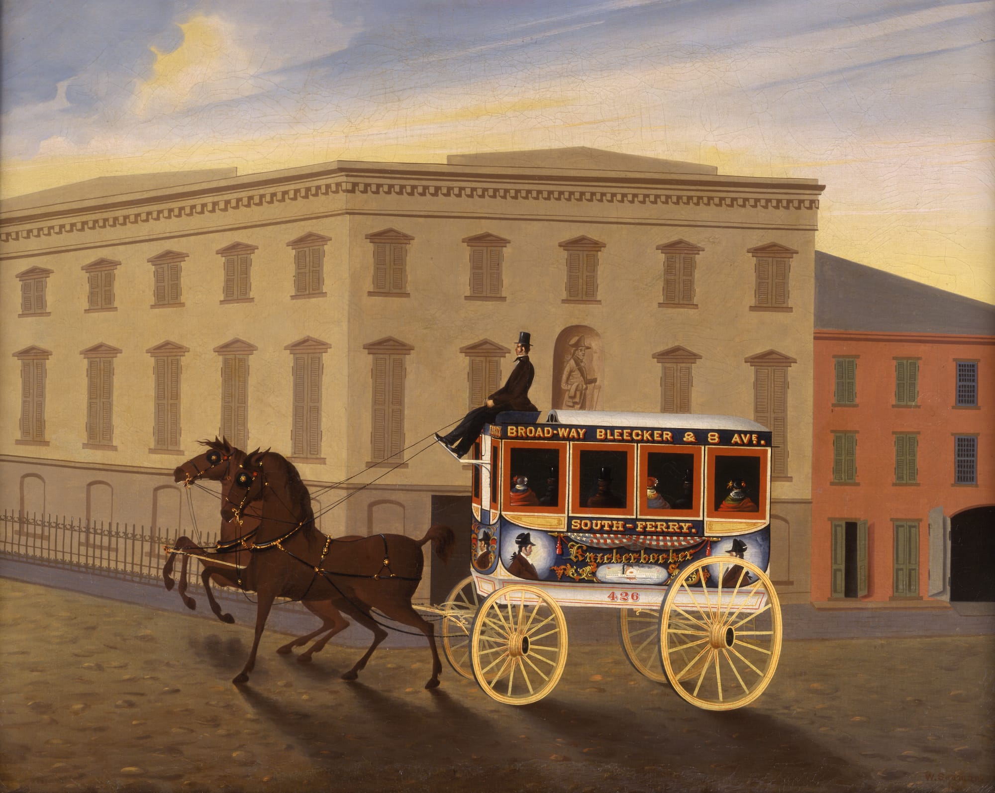 And did you know the city’s first mass transit system, depicted in a William Seaman painting from 1850 called “Knickerbocker Stage Line Omnibus,” was a horse-driven carriage that ferried 12 to 28 passengers on designated routes along the city’s street grid? Walt Whitman often rode the Broadway Omnibus, from which he shouted Shakespearean passages at pedestrians, Ikemoto said.