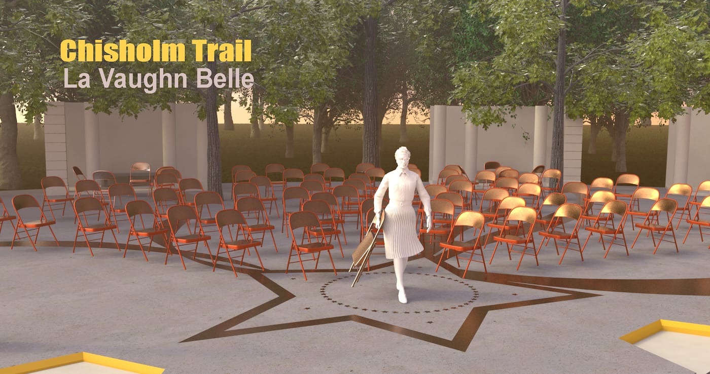 “This proposal reinterprets Shirley Chisholm’s famous quote, ‘If they don’t give you a seat at the table bring a folding chair’ and positions it into a larger framework of mobility. This monument invites visitors to not only think about Chisholm’s personal journey from childhood to elderhood, but also the movement of a people and a nation. For what her historic run for the presidency challenges most is our imaginary of what is possible. Wearing a turban and an eagle pin, she steps boldly into a re-envisioned version of the presidential seal. She challenges us to think about how this petite black woman with a Bajan accent marking her immigrant roots, could represent the promise of the United States both literally and symbolically and how her trail -to use her campaign slogan- could ‘bring U.S. together’.”