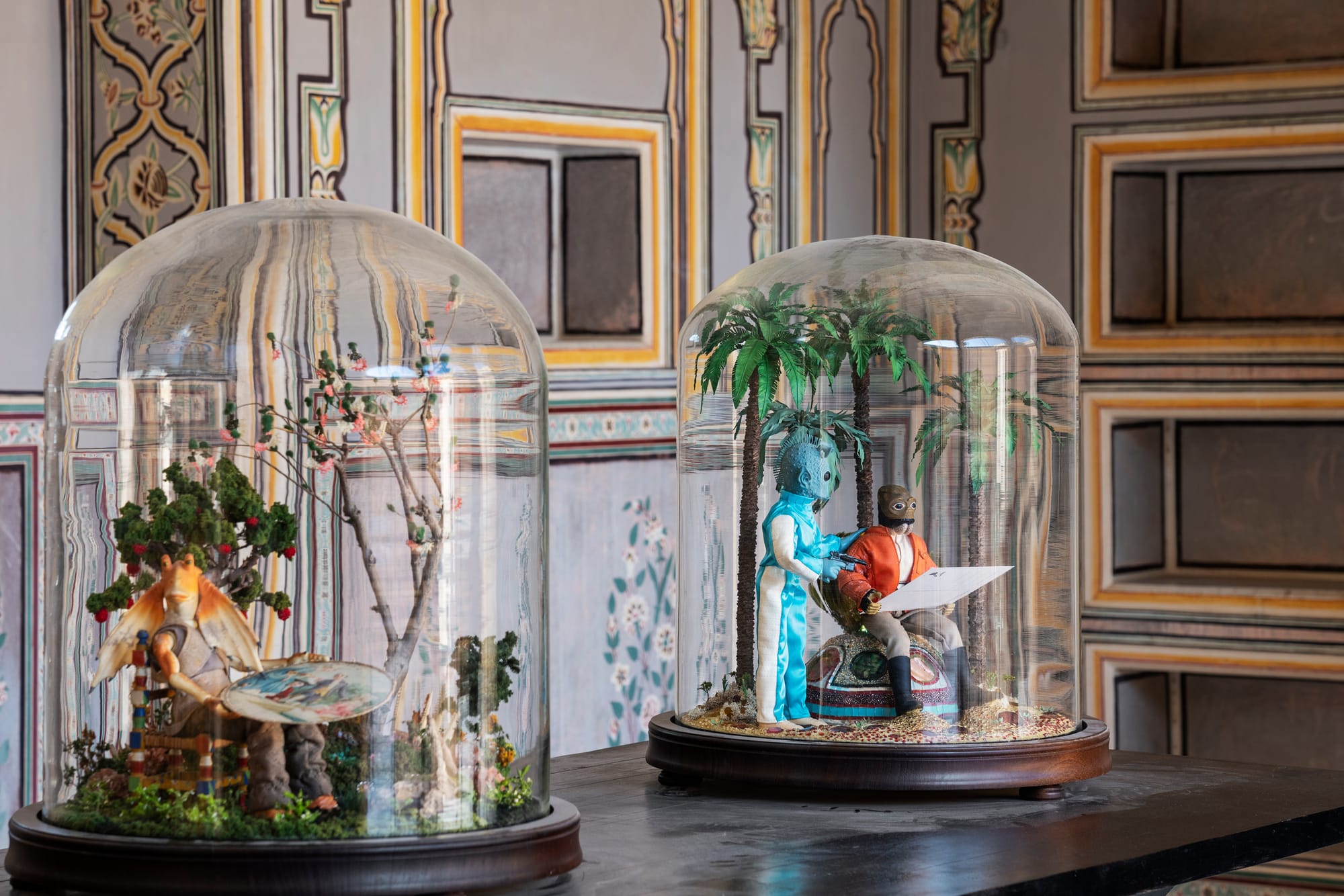 Italian-Argentinian artist Sebastiano Mauri’s “Aliens” (2018) features a set of glass vitrines inhabited with fairytale-like figurines set against forest backdrops. Through these otherworldly characters, Mauri discusses otherness in a world afflicted with ideological divisions.