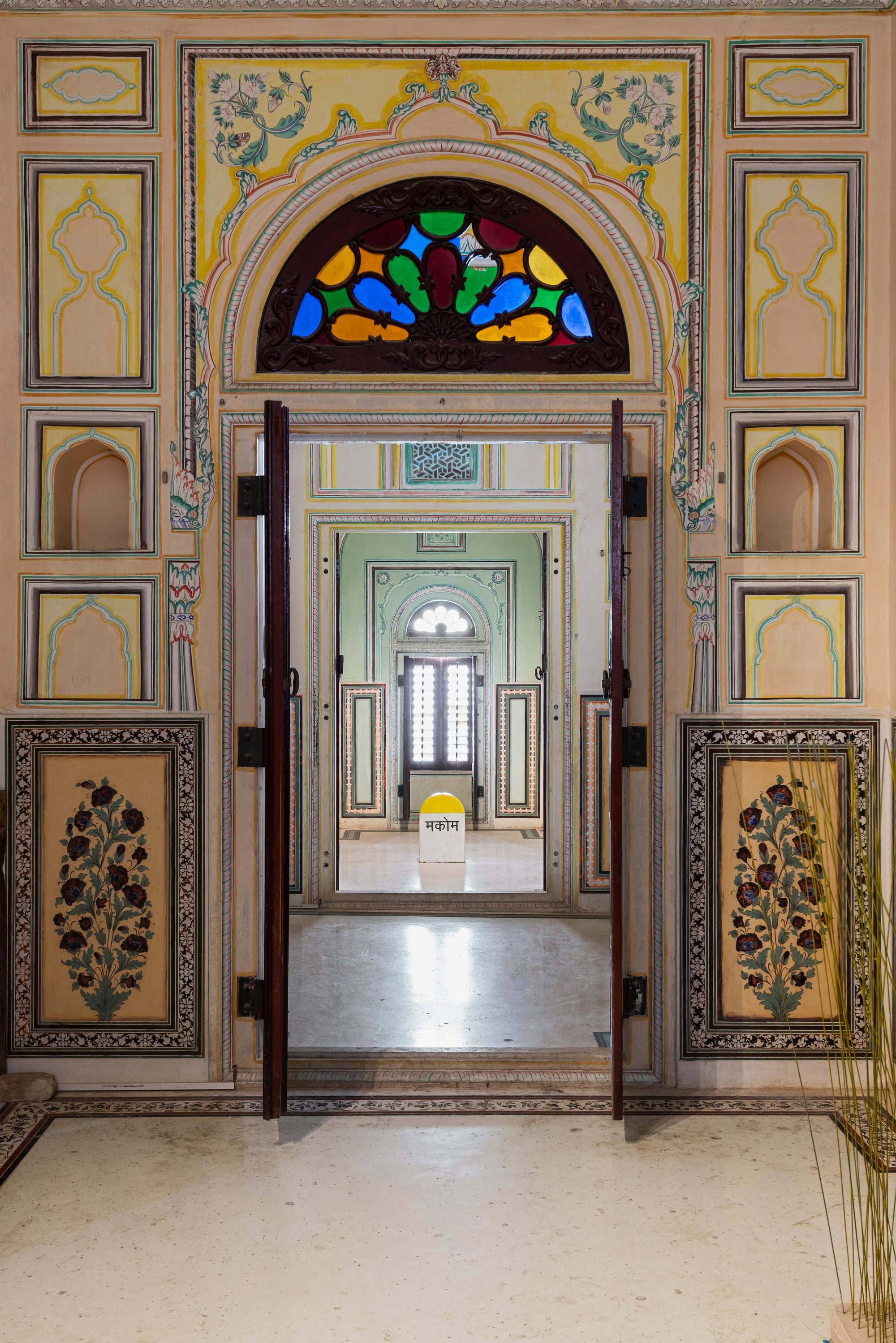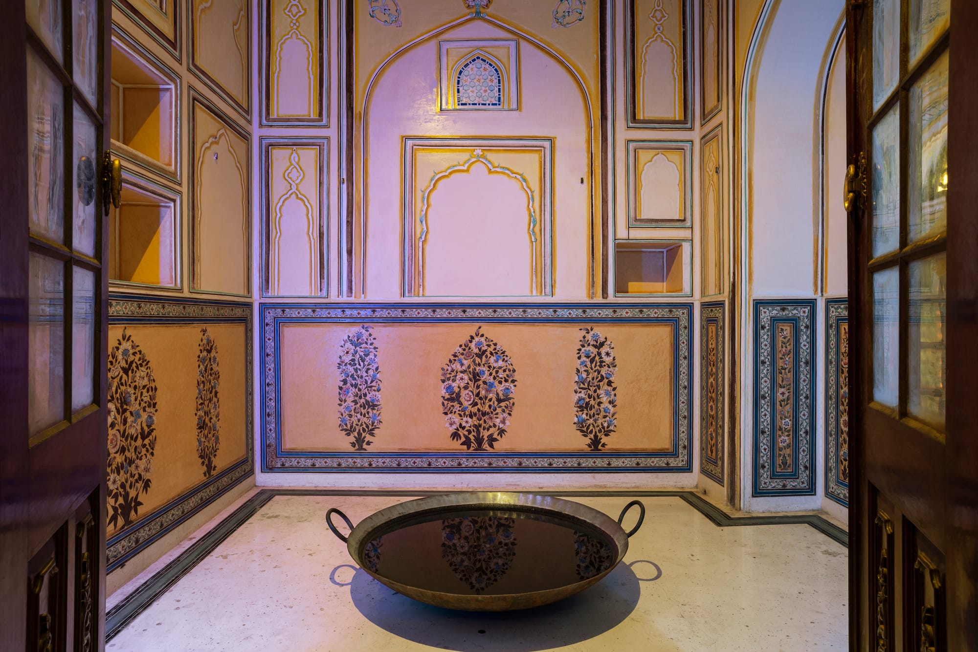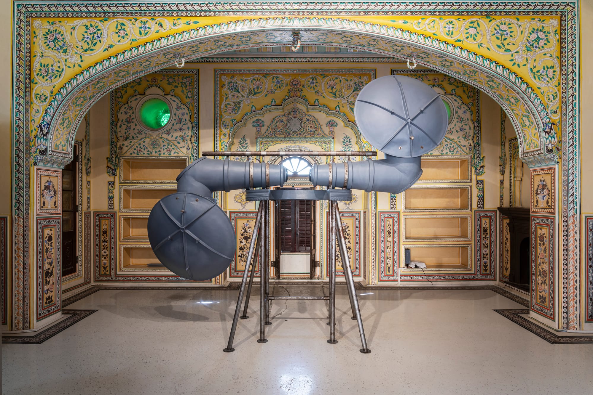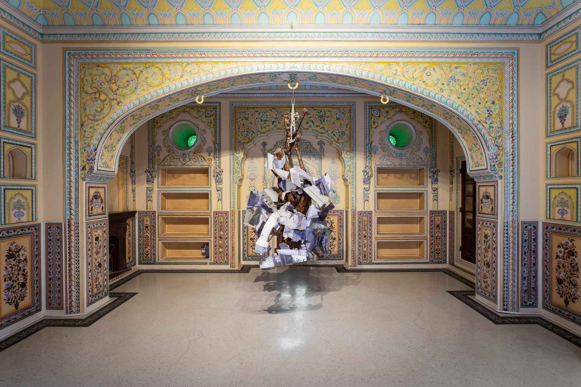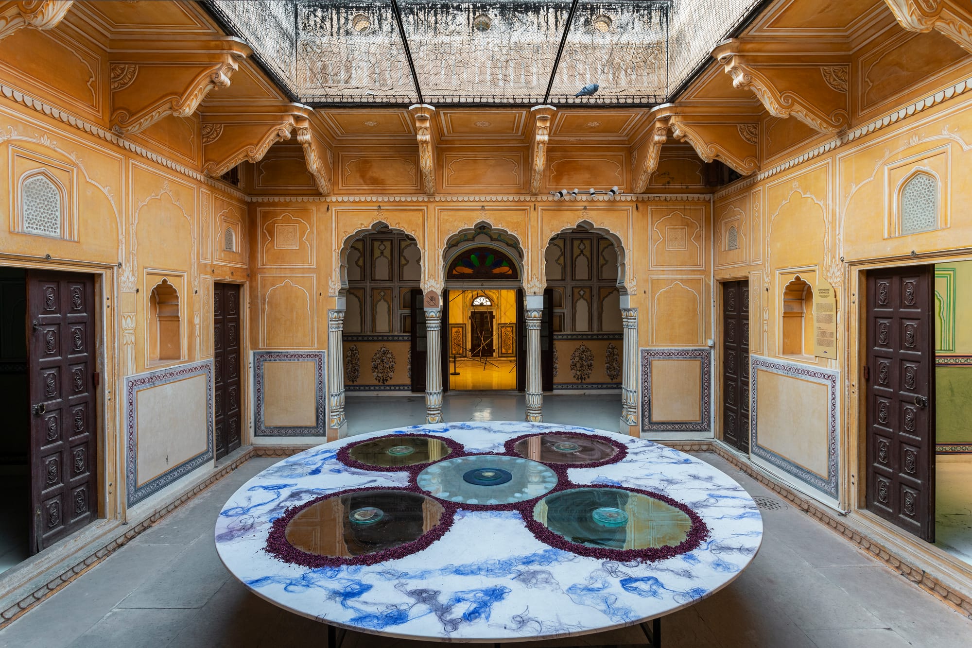 Five large colored mirrors installed on a round table reflect the outdoors through a skylight at the palace’s Maharaja suite. Chrysanne Stathacos’s work, entitled “Five Mirrors of the World” (2018), refers to astronomical diagrams depicted in Tibetan thangkas. The five mirrors — surrounded by roses, hand-printed hair cloth, and Bodhi leaves — represent different aspects of life: energy; existence; personality; emotional landscape; and the way in which we relate to others and to our world.
