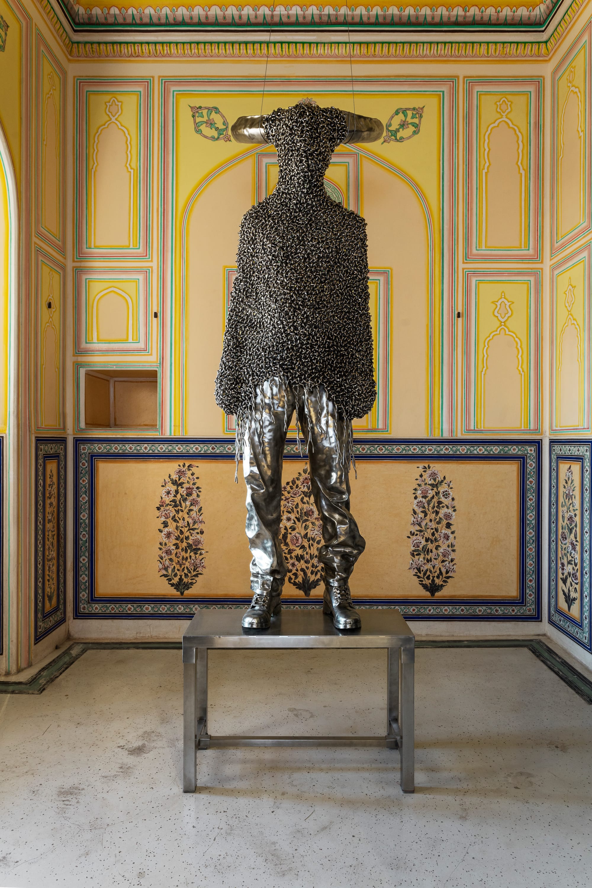 Several of the installations are site-specific. The largest among them is British artist Richard Long’s “River of Stones” (2018), which snakes through the main courtyard of the palace. Long is known for using traditional material like stones, mud, and water to articulate movement through space in his works. This installation is created from local red sandstone sourced from the nearby Aravalli mountains.