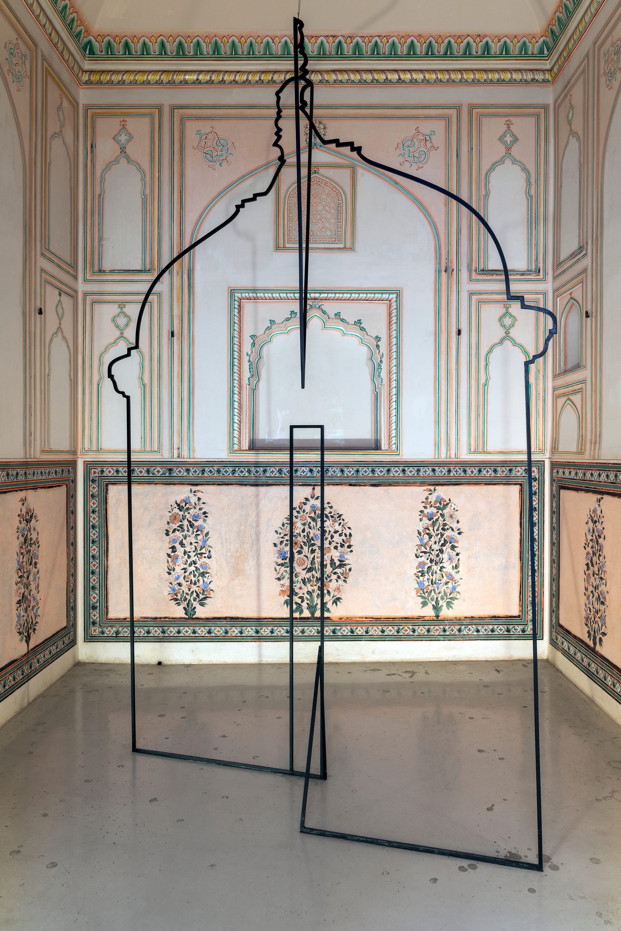 Ayesha Singh visually overlays the arched hallways of the palace with architectural sculptures that borrow from Gothic, Indo-Saracenic, Victorian, Mughal, sacred Hindu, and Brutalist architectural styles found in India and the UK. Her two sculptures, “Hybrid Drawings” (1) and (2) from 2018, investigate evidence of colonialism and social hierarchy embedded in the ornamentation, design, and materials of architectural facades in India.