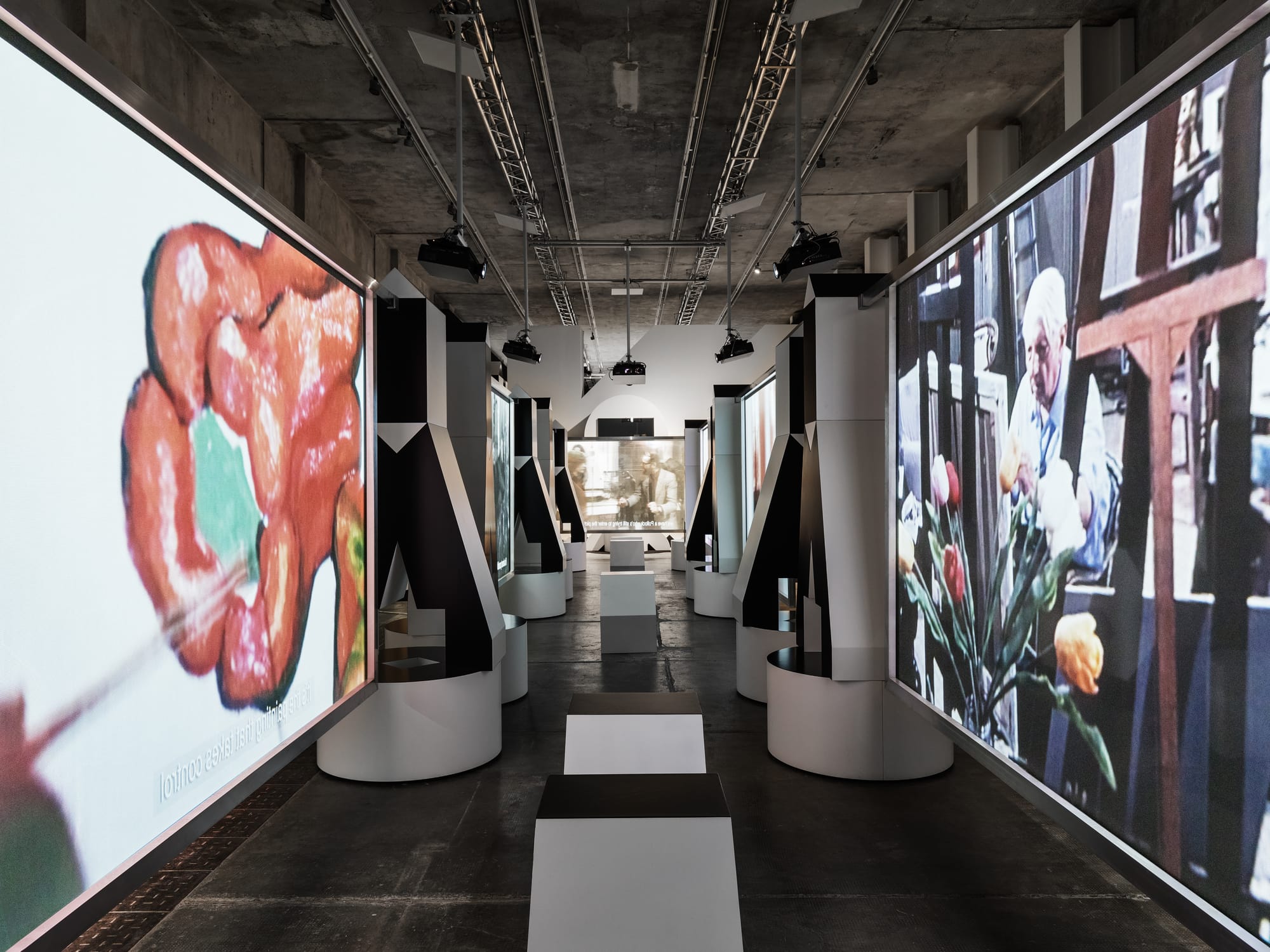 Moving forward through the exhibit, the heavy atmosphere of the Years of Lead is represented by a black corridor full of monitors transmitting news of the tragedies and terrorist attacks that marked 1970s Italy. One after another, the viewer is assailed by news of kidnappings, killing of magistrates, jurists, and journalists, and train bombings. This time, the overlapping audios enhance the sense of claustrophobia and disorientation of the time. One can’t help but notice the markedly male presence on the TV screens — not only because the broadcasters were all male, but because the objects of all these atrocities were male as well, from former Prime minister Aldo Moro to writer Pier Paolo Pasolini.