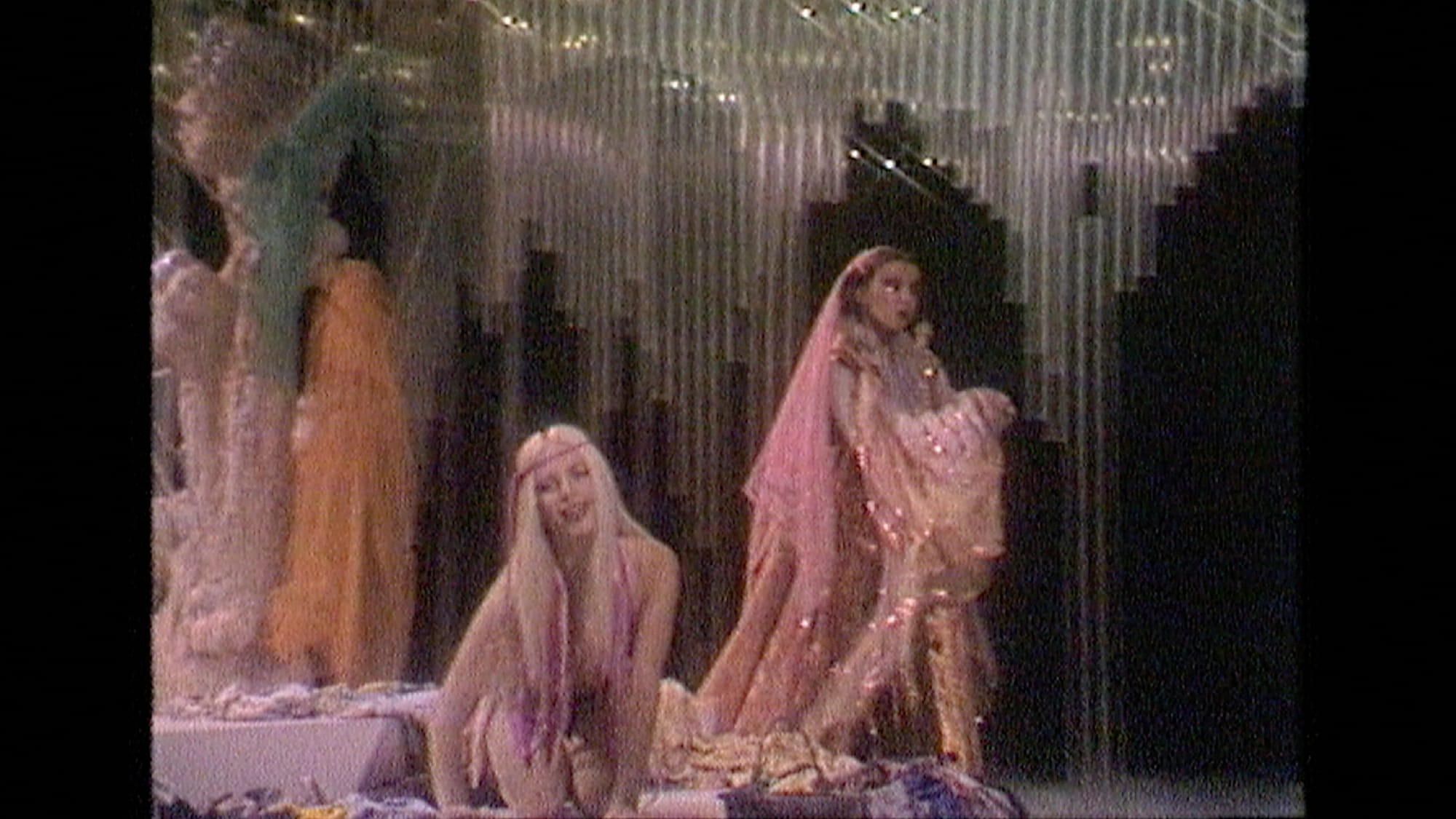 An extract from a popular episode of Milleluci (1974), the first Rai variety show to be presented by two women, shows hosts Raffaella Carrà and Mina next to the Kessler twins, singing a song making fun of male sexual appetite. Only four years later, Ilona Staller, a.k.a. Cicciolina — the first woman to bare her breasts on Italian national TV — entertained her public dressed up as a provocative nymph.