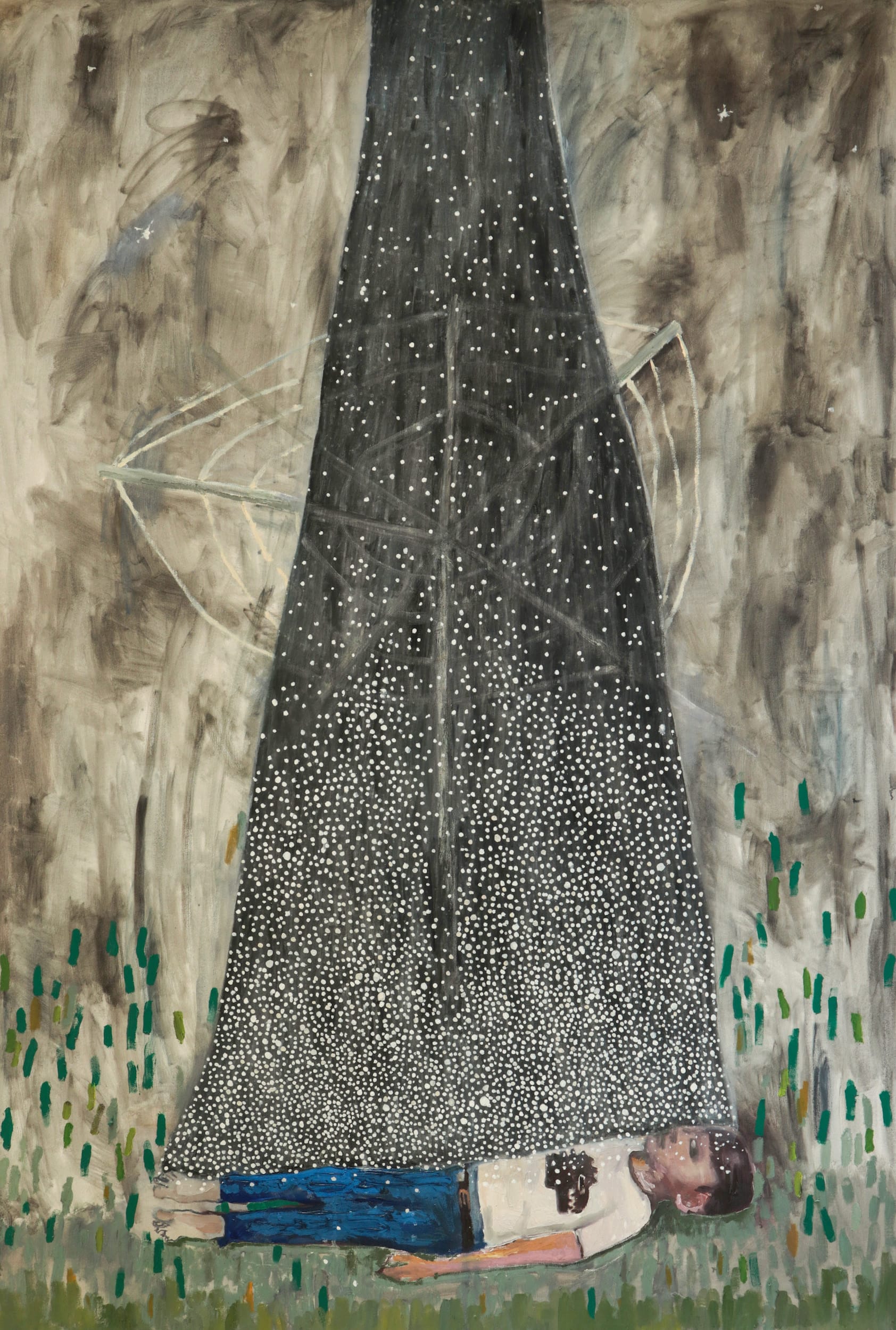 The compressed space and combination of downward and forward angles are reminders that seeing what is in the world requires actively engaging with it at all times. In “Alien Abduction” (2024), one of three large paintings in the exhibition, a barefoot adolescent boy lies on the grass, beneath a black cone shape filled with tiny dots of white light, some of which fall on him. Milroy again makes the painting self-contained, with no trace of irony. Is this a memory?