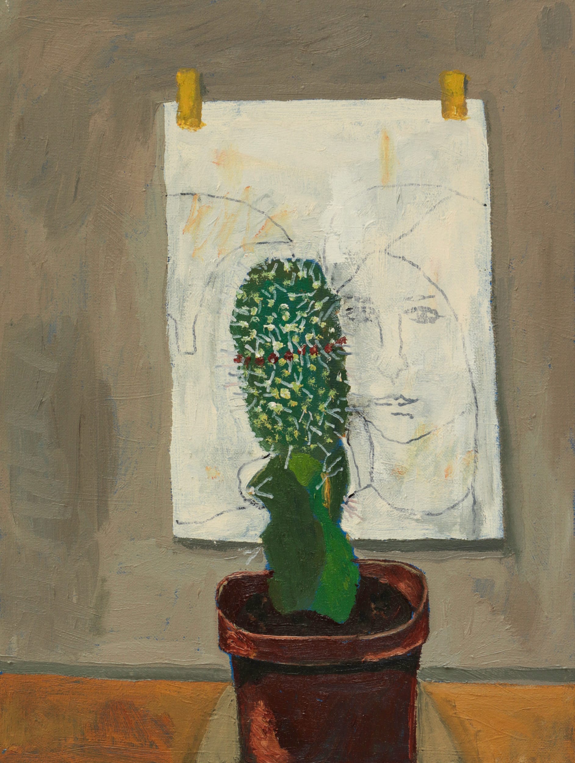 "Erased Drawing” (2022) depicts a potted cactus in front of a drawing taped to a mottled khaki gray wall. The drawing portrays what looks like a young woman facing forward and a young man in profile, his face obscured by the plant. The juxtaposition of the drawing and cactus is disarming. The pairing of these two items might have been influenced by Surrealist art, but at the same time it has a discovered quality, as if he saw it in his own house. The yellow marks on the paper could feel arbitrary, but they don’t come across that way. Yet, importantly, they remain inexplicable.