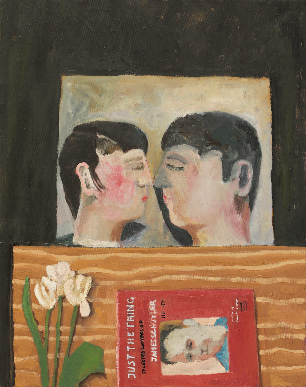 “Just the Thing” (2024) is divided horizontally. The bottom is a table whose surface is flat against the picture plane; on it is a copy of Just the Thing: The Selected Letters of James Schuyler 1951–1991, edited by William Corbett, beside white flowers. The top is the wall, on which we see two heads facing each other, surrounded by black. Is this a photograph or a painting? No answer is forthcoming.