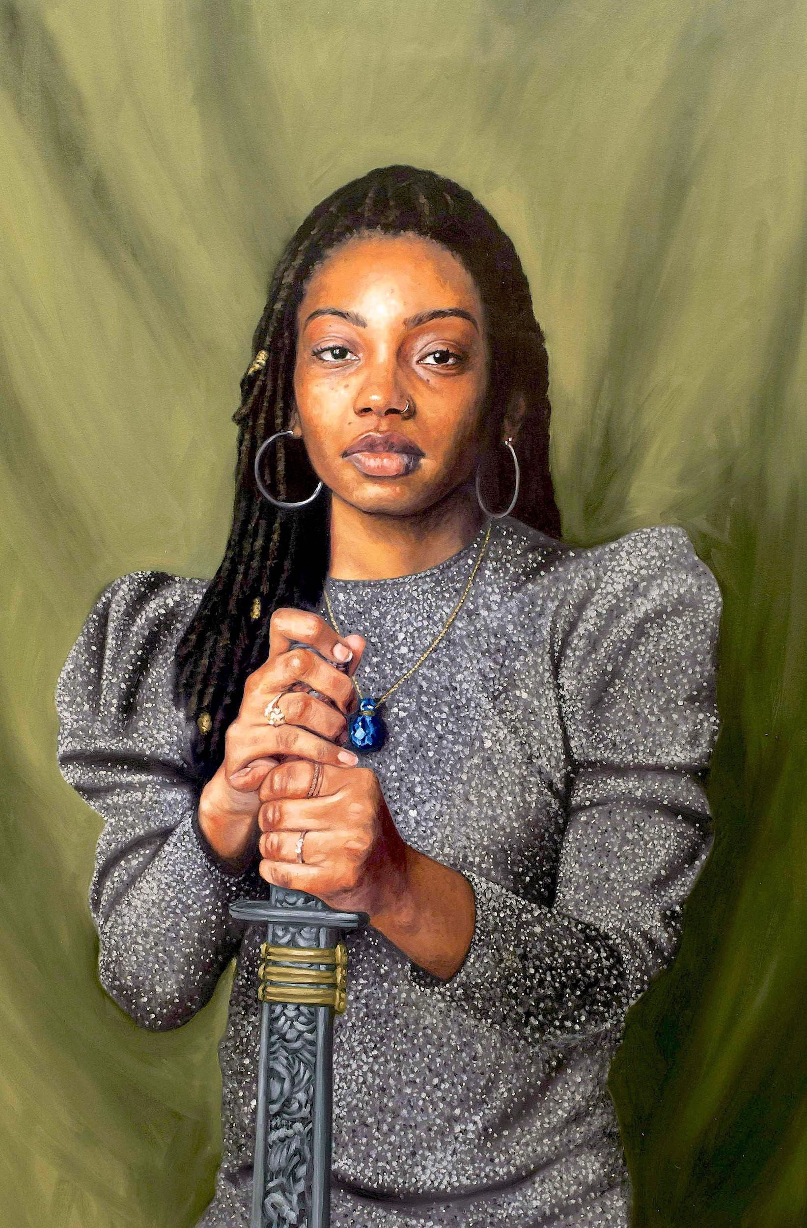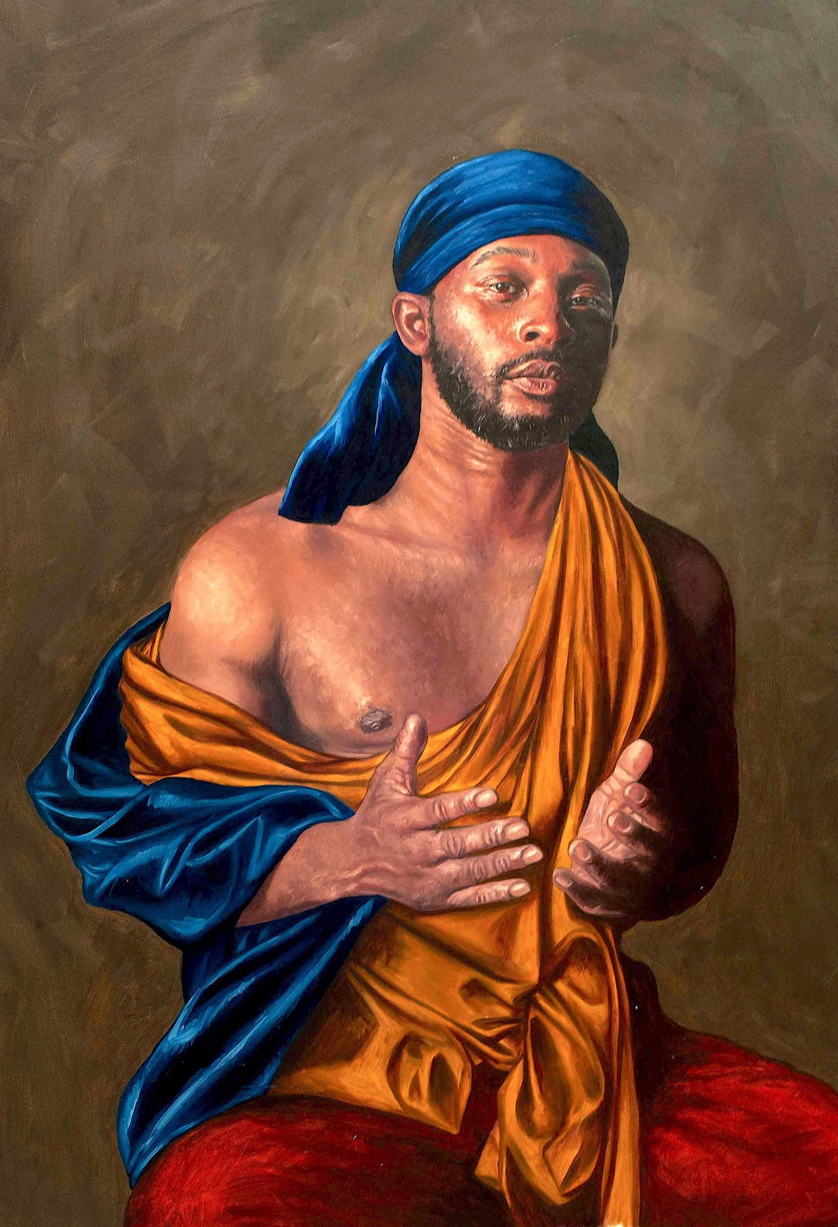 Influenced by Renaissance- and Victorian-era portraits, her paintings emphasize how people of color have always played important roles in history but have often been excluded from portraiture as a genre. The models’ dress and poses reference religious iconography, emulating canonical depictions of saints and other angelic beings to fuse the past with the present and convey the spiritual essence of each person.