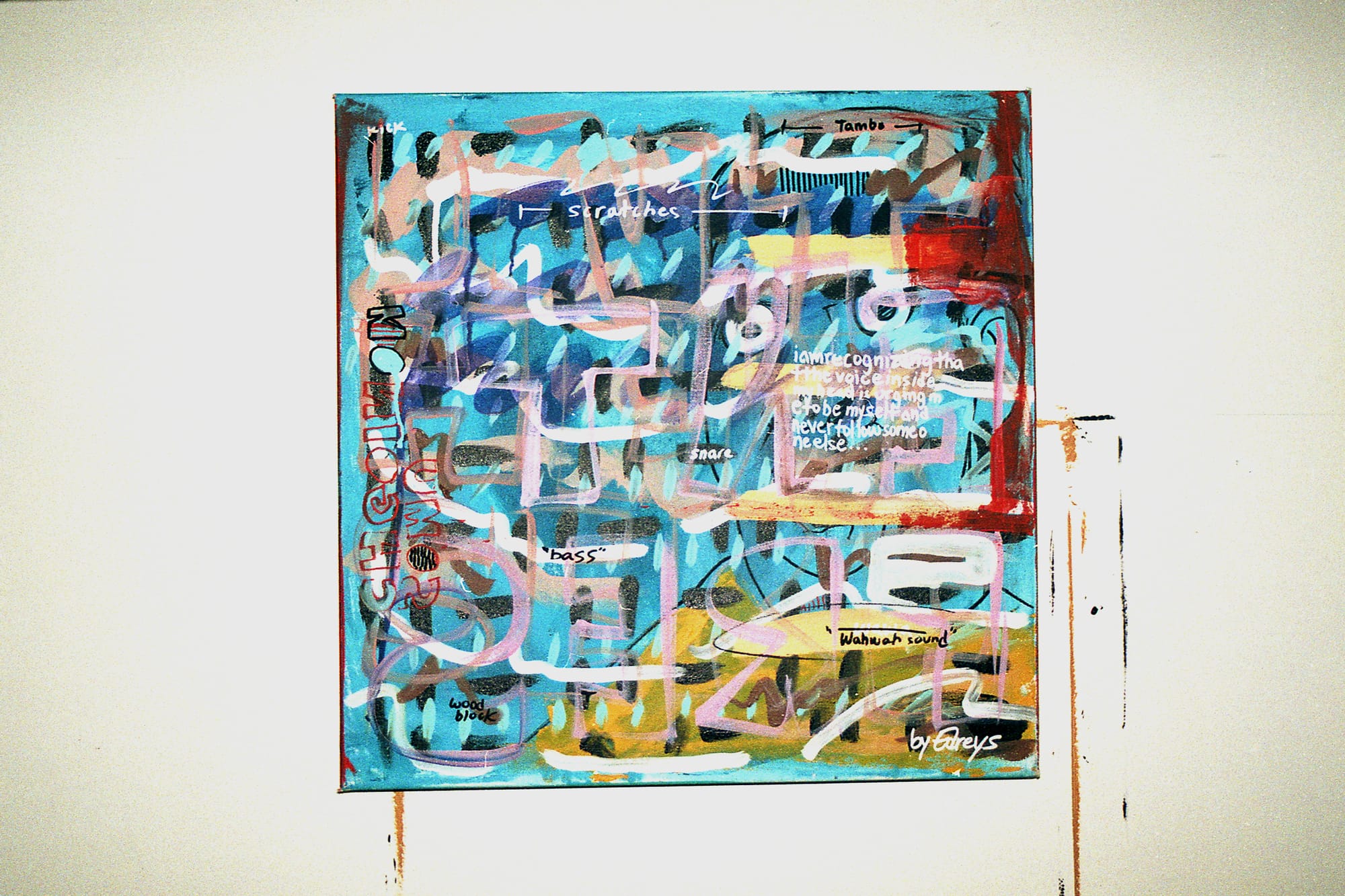 Much of Edreys’s art is intertwined with his love of music. Works like “Steve Biko (Stir It Up)” bring some of his favorite songs to life, illustrating their sound, rhythm, and instrumentation through a lexicon of symbols and marks. His distinct linear style can also be seen in public art around the city, most notably the Freedom Wall. The 2017 project, commissioned by the Buffalo AKG Art Museum’s Public Art Initiative, contains portraits by artists Julia Bottoms, John Baker, Chuck Tingley, and Wajed to honor several local and national African-American leaders. It is iconic in the city’s creative landscape, finding inspiration in Black history and fostering dialogue around the collective struggle for social justice.