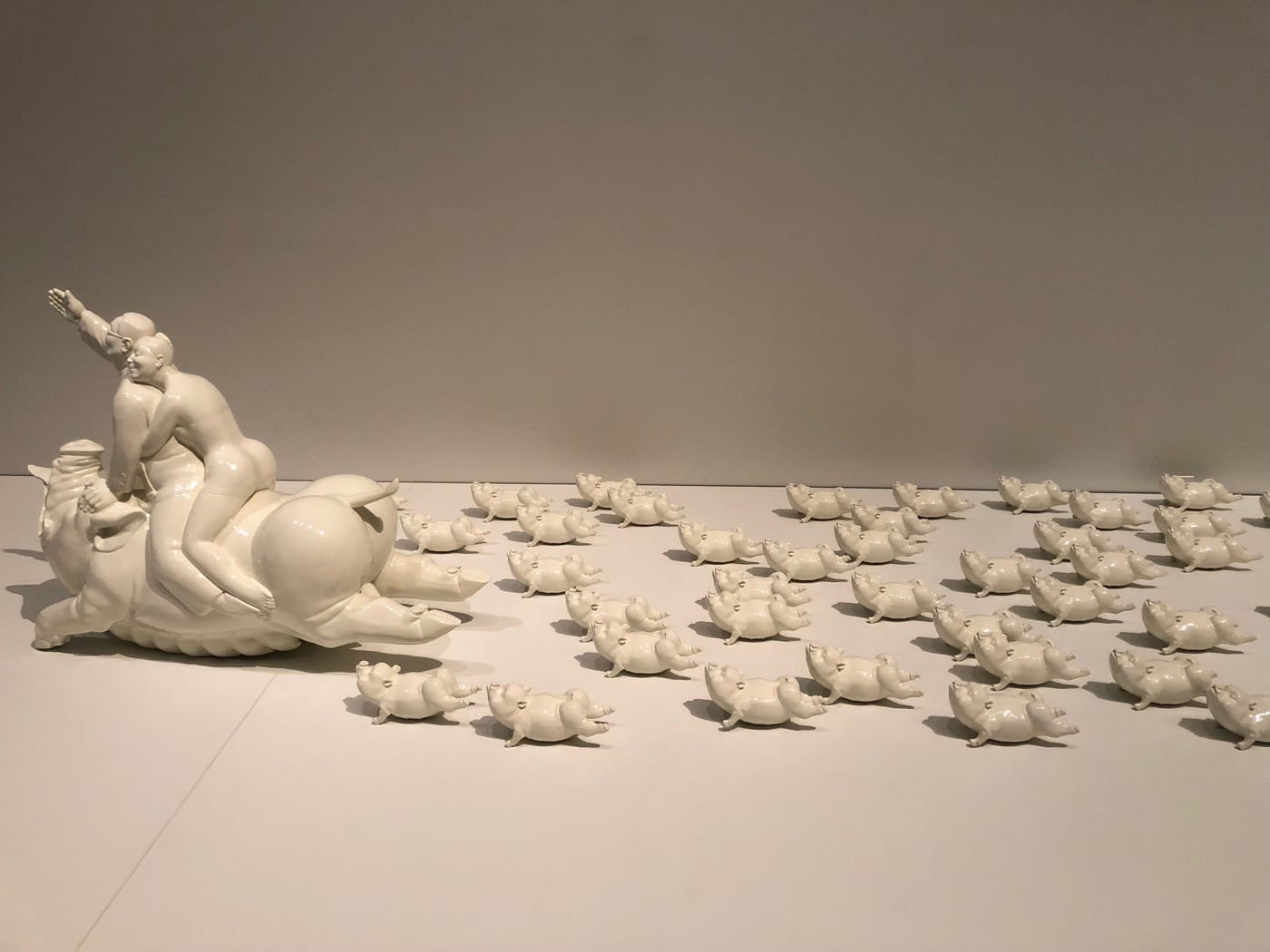 Perhaps the best-known modern example of satirical anthropomorphism is George Orwell’s 1945 book Animal Farm. Following a revolution on the farm, Napoleon the pig — a populist character based on Joseph Stalin — comes to rule. Similar ideas of wealth and human indulgence are the keys to understanding the porcine imagery in Chen Wenling’s “Riding to Happiness (with 56 little pigs)” (2006). The expansive display of nearly identical fiberglass piglets are led by two humans riding a larger, fat-bellied pig, together questioning the rise of materialism within Chinese culture.