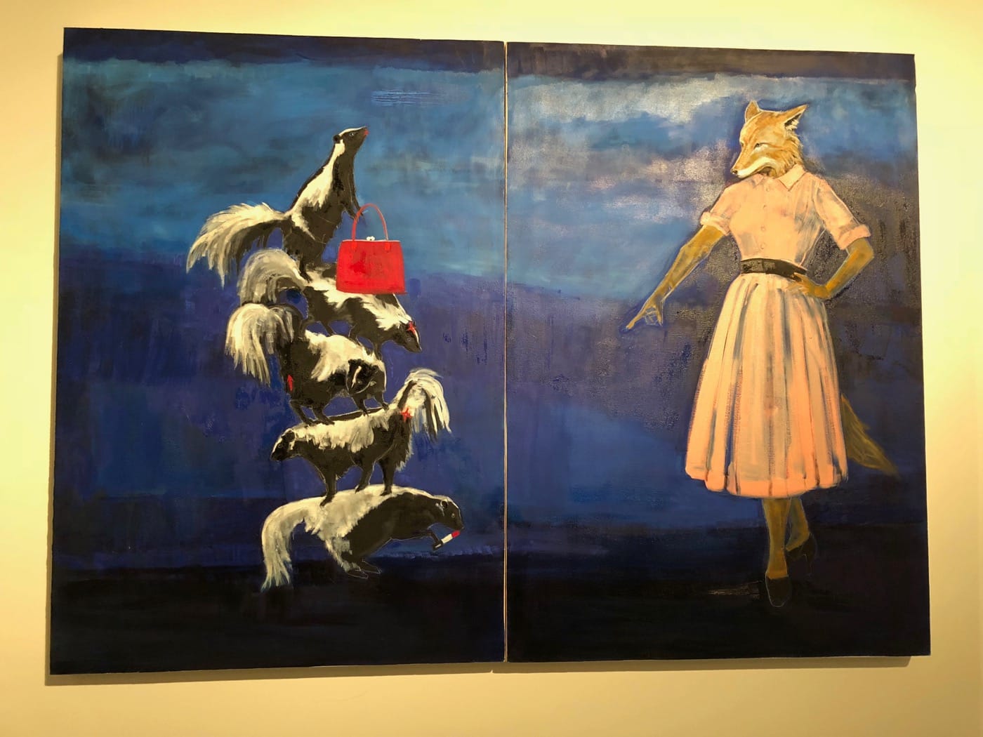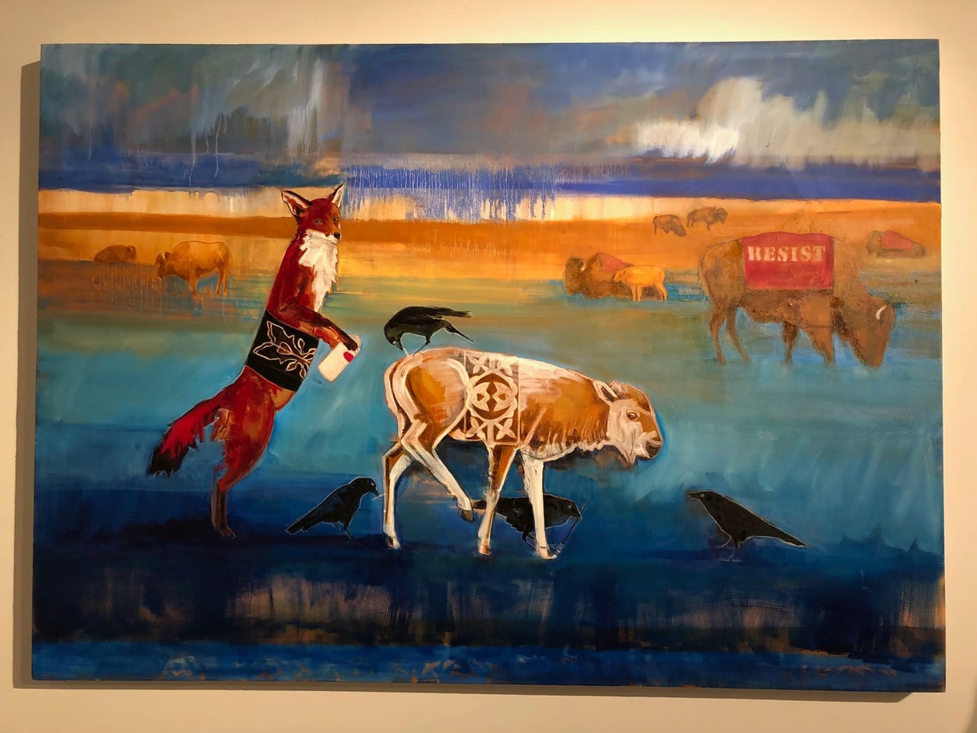 The exhibition includes an adjacent show that displays a number of paintings by a native artist who has similar interests — Eyes On: Julie Buffalohead. Julie Buffalohead is a citizen of the Ponca tribe of Oklahoma and uses animals key to Native American folklore — the coyote, the skunk, the buffalo, the fox — to comment on both Native and non-Native communities. Her work entitled “A Little Medicine and Magic” (2018) addresses the cultural expectations imposed on women: purses, lipstick, pink dresses, and other ideas of femininity are depicted. The skunks standing atop one another bear lipstick marks on them symbolizing the “honor marks” Ponca men may have tattooed on a young woman of their choice following distinguished honor in battle. Another, “White Buffalo Reborn” (2018) depicts a fox spray-painting a white buffalo, an animal sacred to many Indigenous tribes. A larger buffalo stands in the background, wearing a blanket that says “Resist.”
