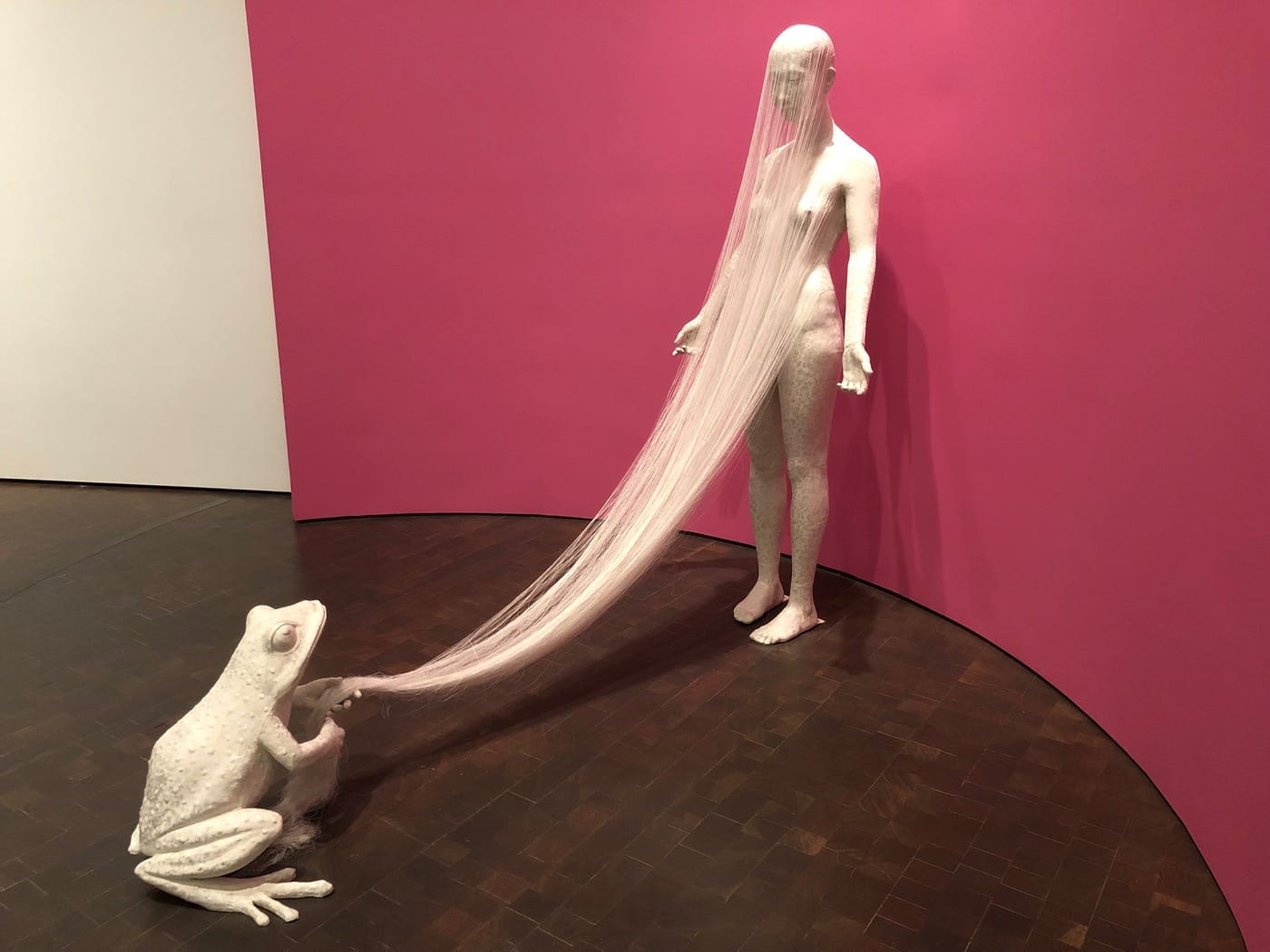 One of the most arresting pieces in Stampede is Lin Tianmiao‘s “Initiator” (2004), a work made of fiberglass and silk that evokes the fairytale of the frog prince. It is the frog who controls the silk veil overtop the naked woman he faces. She stands facing the frog, fully vulnerable with palms face outward. She is waiting to be directed by an animal who may or may not be her prince.