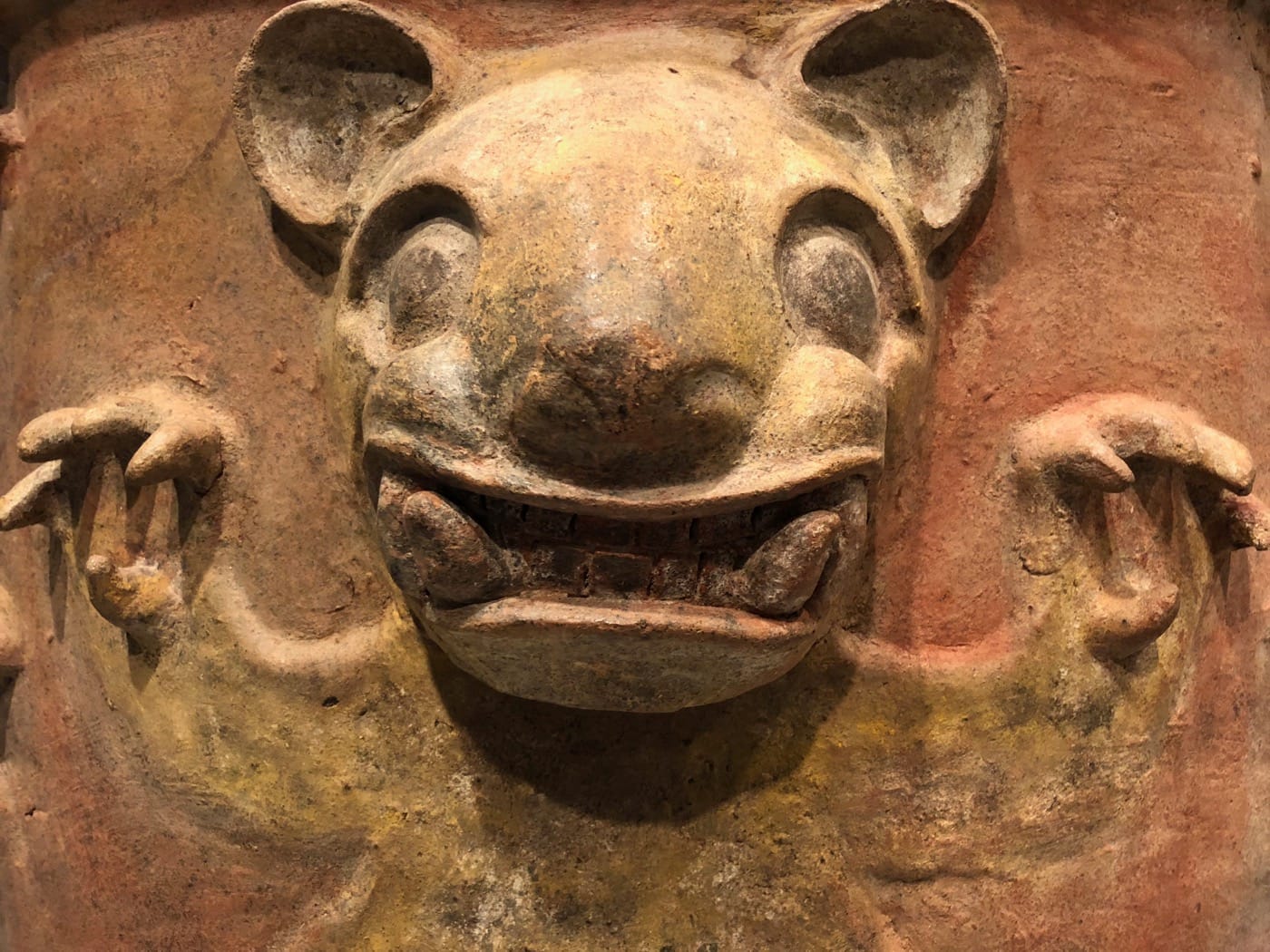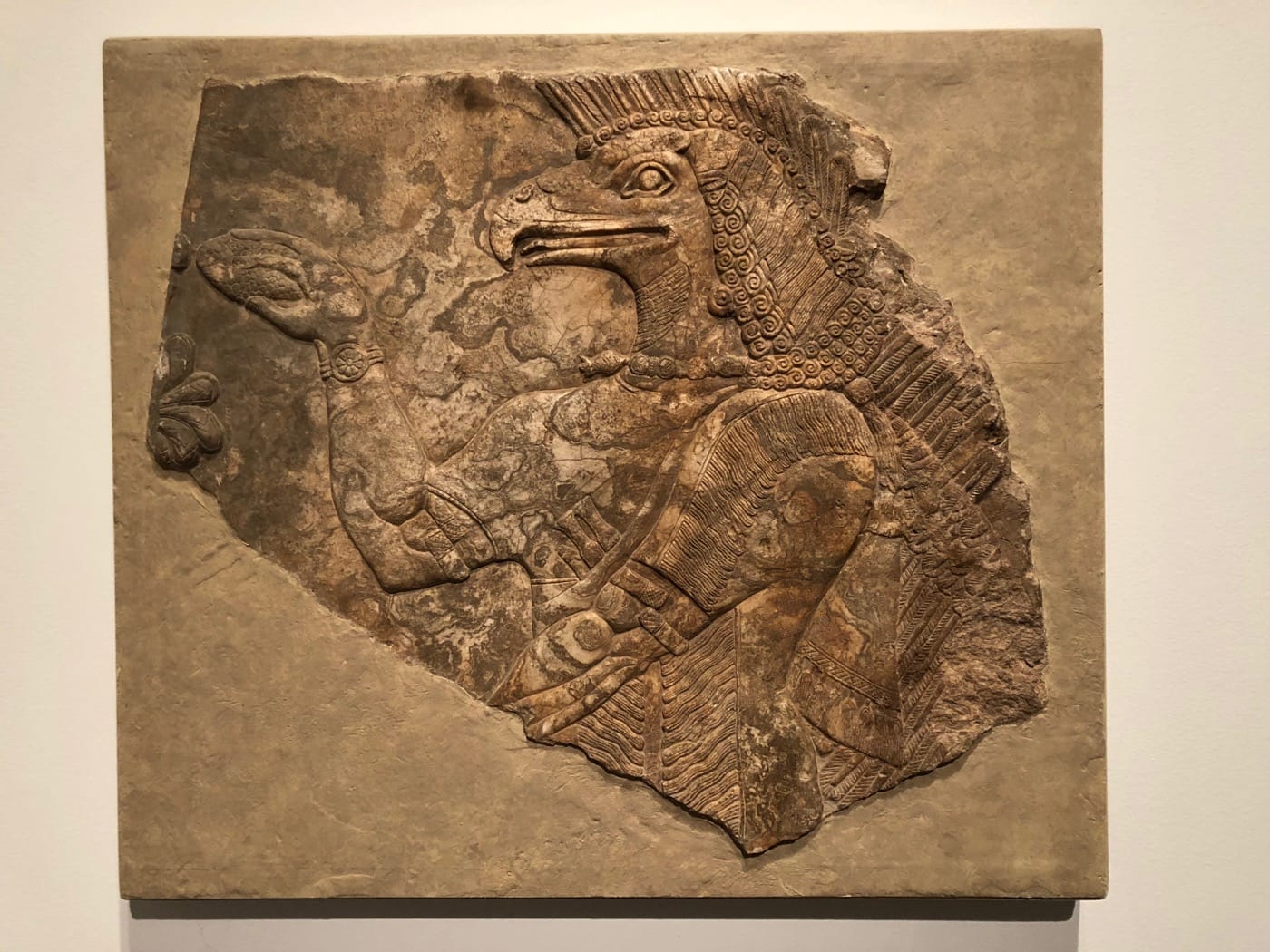 The show also underscores the use of animals as allegory, prized within their cultures as models of virtue and strength. The gilded wood “American Bald Eagle” (1825) by American artist Steven Hassam evokes patriotism and the idea of a United States in the early 19th century. Meanwhile, Mayan effigy urns (600-900 CE) used fierce ceramic jaguars to point to the strength of the powerful men whose remains lie inside them. An Assyrian stone carving of a bird-headed deity from the palace of King Ashurnasirpal II (885 BCE, Calah, Iraq) illustrates that animals could even serve an apotropaic function, that is they were seen as being able to protect a space from nefarious spirits or human malicious intent. We often look to animals to amend the weakness we feel as humans.