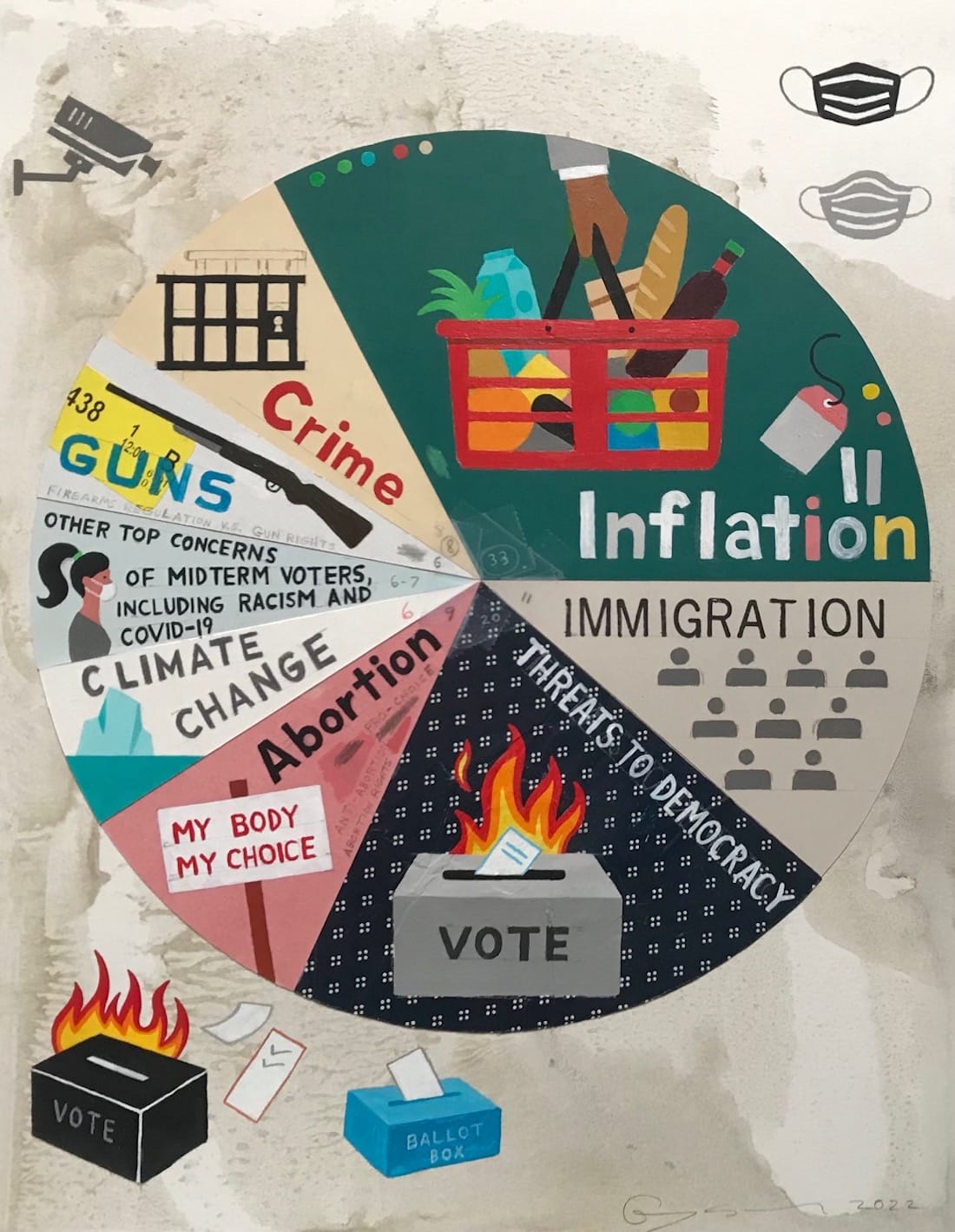 As the titles indicate, the subjects include reasons for “Unfriending” (2011), “Top Concerns of Midterm Voters (study)” (2022), and “Leading British Phobias” (2011). This sampling proposes that your opinion about anything seems to matter to someone. Dating between 1998 and 2022, the works communicate the ubiquitous role pie charts (or surveys) play in our lives. “Purse Essentials (Study)” (2022) refers to a survey on what people consider essential objects to be contained in a purse. According to Colson’s chart, lip balm, gum/mints, cellphone, pain reliever, hairbrush, tissues, ATM card, cash, and credit cards are considered indispensable. “Other items women specify as the most essential to carry in their purse” are “sunglasses, tampons, and condoms.”