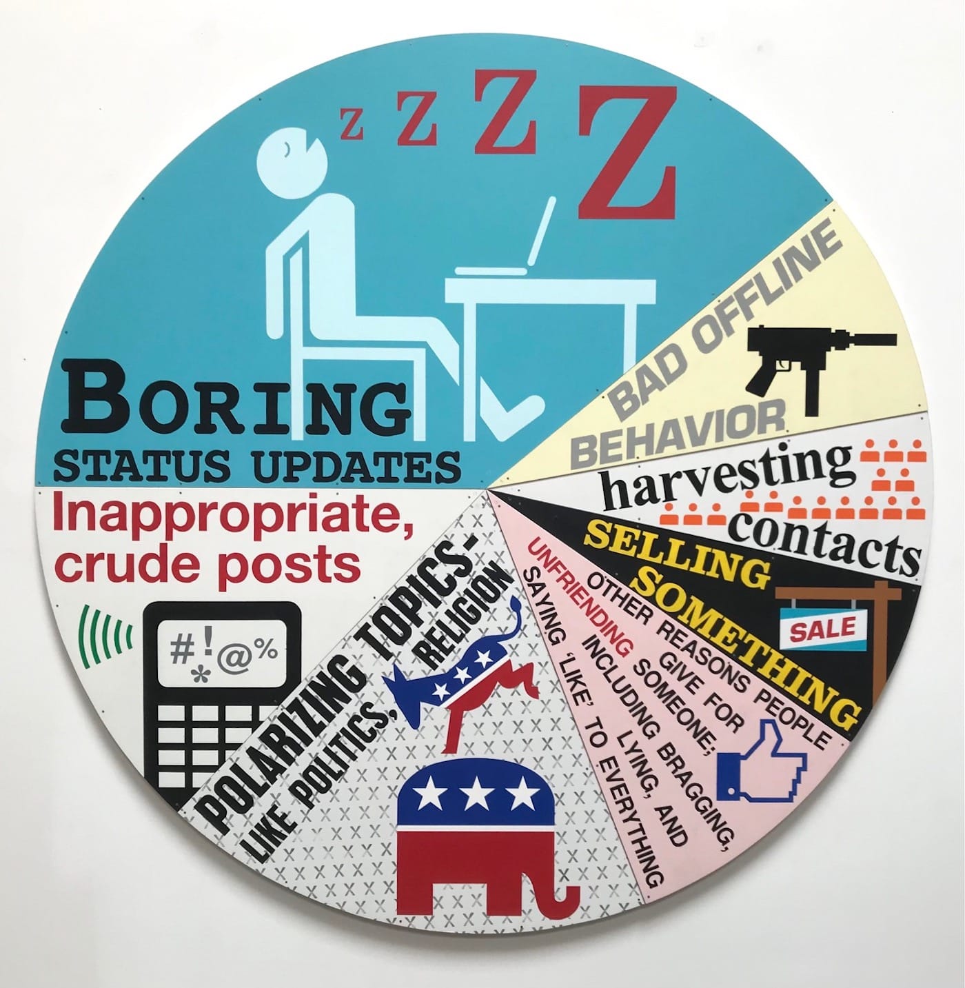 The artist’s droll paintings present the pie chart as a useful monitor of a group’s behavior, while also revealing it to be exclusionary and superficial.