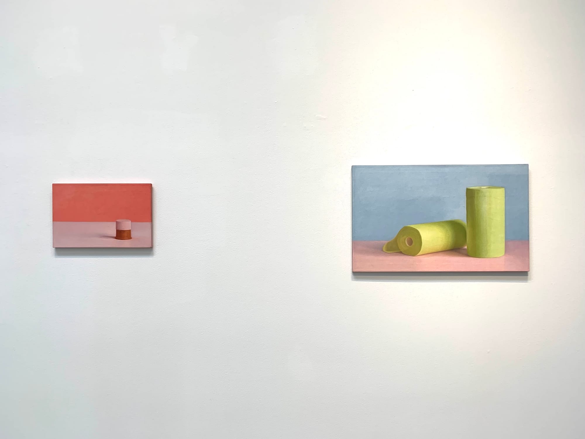 LOS ANGELES — Although Martha Alf (1930-2019) is recognized for her distinctive pear drawings, her inaugural posthumous exhibition at the Michael Kohn Gallery, Opposites and Contradictions, sheds new light on her breakthrough moment as a painter. While the exhibition presents a small selection of later drawings, hung salon-style, the primary focus is on the body of work that earned Alf a place in the 1975 Whitney Biennial: her paintings of toilet paper rolls, which she preferred to call “cylinders.” Such phrasing is significant because, by this point in her career, she was a formalist who boldly applied what she learned about abstract painting to still life, but with a twist in the form of unconventional subject matter. As she wrote at the time, she was “finding reality through an artificially contrived arrangement customarily associated with the stage or an altar, which raises the most mundane of material objects in our society to the authoritative power of an icon. It is about the absurdity of the idea that a roll of toilet paper is so important to our society that it can become a symbol of it.”