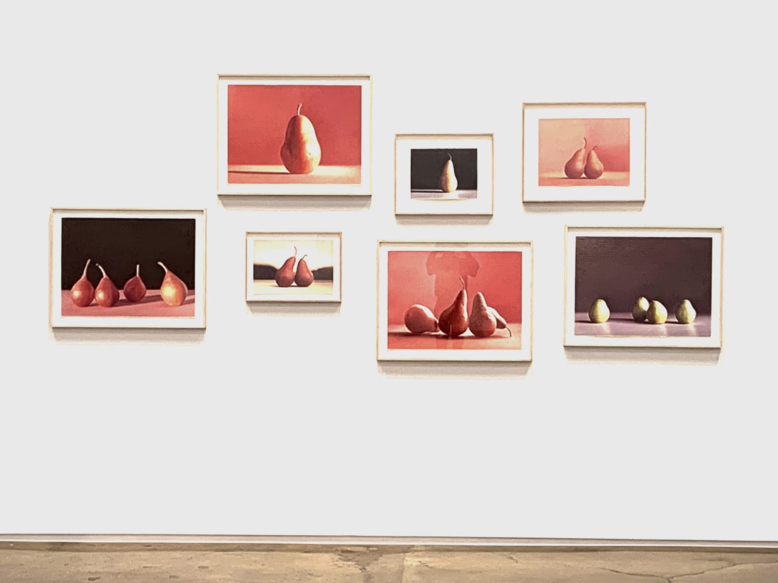 Without forsaking light and shadow in “Spray Deodorant Caps” (1970), Alf painted a cylindrical shape made by stacking a light pink deodorant cap over a darker pink one, and inverted the color arrangement in the field by placing this homemade sculpture on a light pink shelf against a dark pink background. For “Zee Green” (1971), inspired by the pastel colors of 1970s paper towels, facial tissue, and toilet paper, she created an interaction between the two paper towel rolls by standing one up and laying the other prone, foreshadowing the anthropomorphic properties she would eventually give to pears. All this is set up on a pink shelf against a powder blue background, a palette that she called “bathroom colors.”