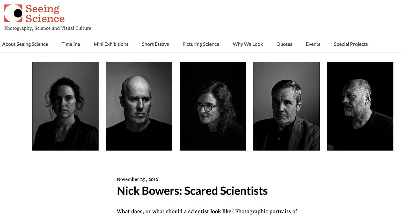 For example, artist Oliver Wasow’s Picturing Science involves groups of themed images from online sources, including scientist biopics and remote wildlife photography. Short essays from contributors working in the arts, humanities, and sciences cover such subjects as early films that featured science and technology, the historic relationship between science photography and art museums, and Berenice Abbott’s photographs for scientific publications. Weekly mini-exhibitions have recently highlighted Nick Bowers’s 2014 series Scared Scientists, for which he asked his subjects to contemplate the implications of their findings; Nancy Burson’s pioneering 1970s experiments with MIT engineers to morph faces to simulate aging; and Thomas W. Smillie’s 19th-century shots as the first official photographer at the Smithsonian. Ultimately, a book will be published with some of the material in Seeing Science.