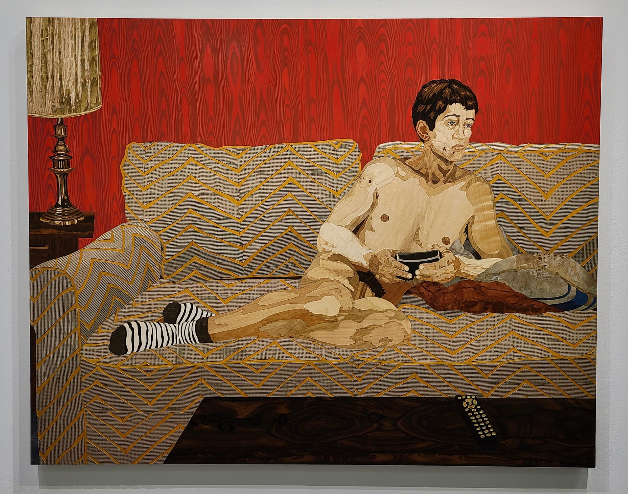 At James Cohan gallery, New York: Alison Elizabeth Taylor, “Sketch for a Still Life” (2020) marquetry hybrid, 50 x 63 inches
