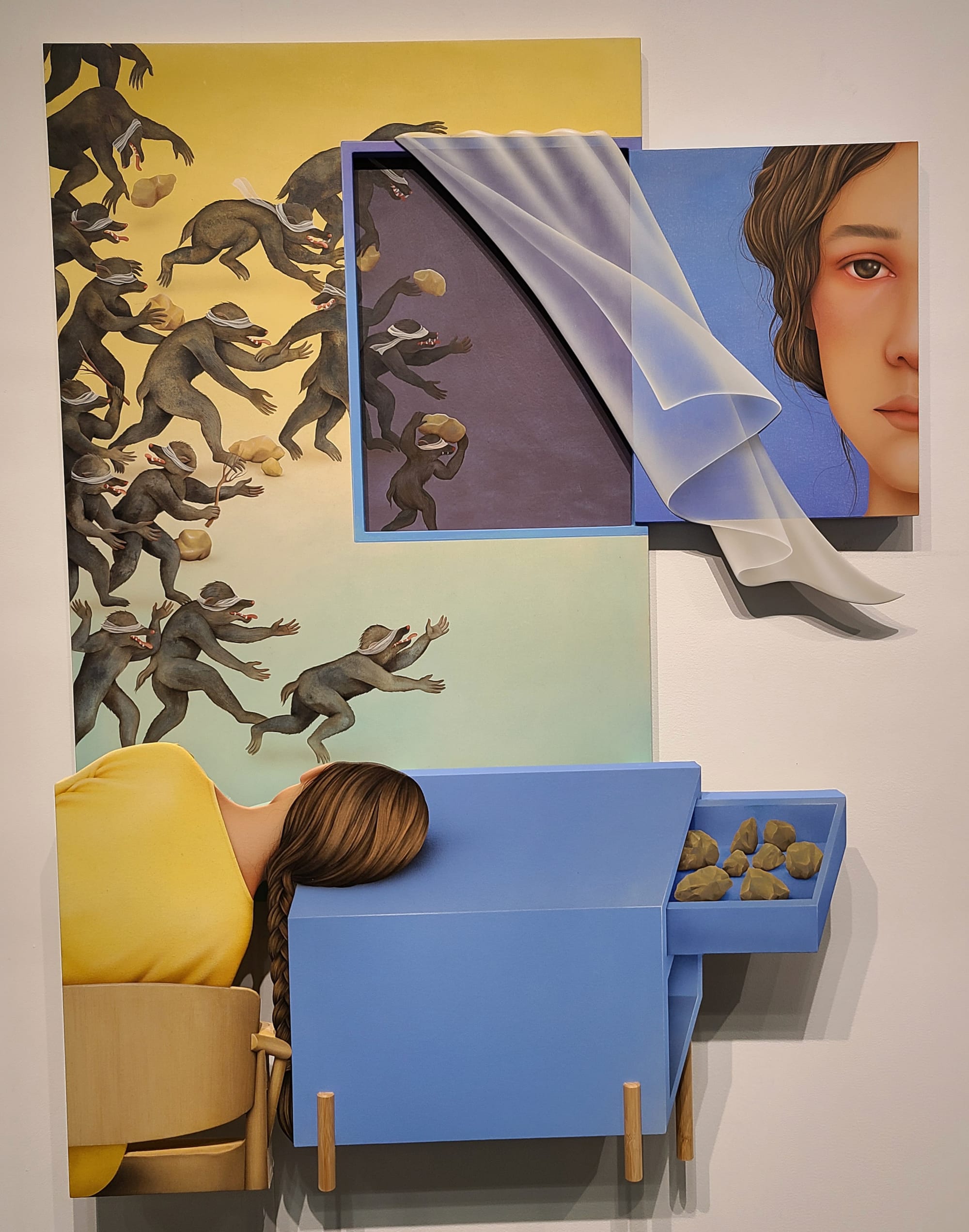 At Rachel Uffner gallery, New York: Arghavan Khosravi, “Watching” (2021) acrylic on canvas over shaped panels, wood cutout and colored pencil 64 x 48 x 5 inches