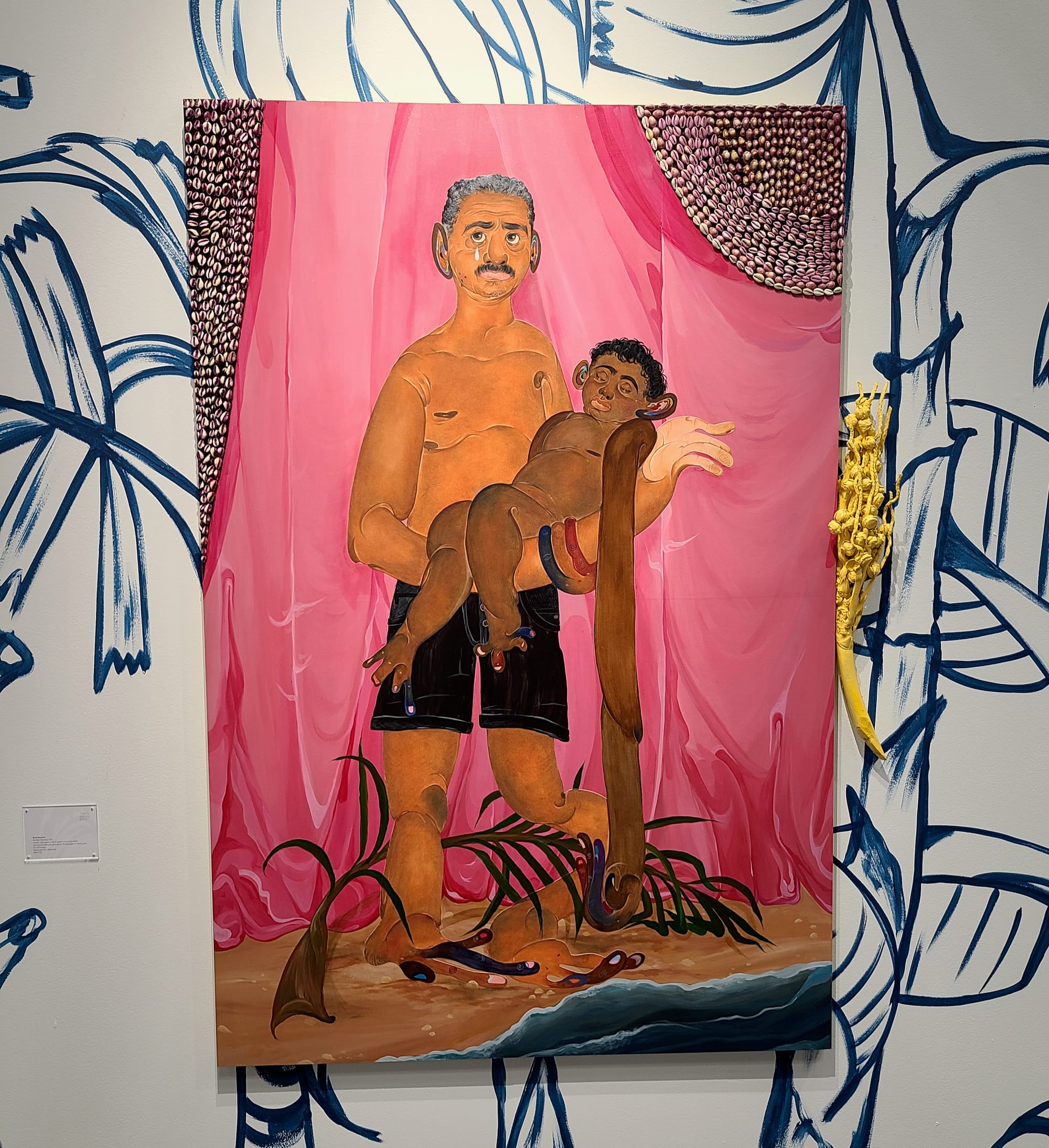 At Thierry Goldberg gallery, NewYork: Bony Ramirez, “Del Mar Venimos” (2021) acrylic, color pencil, soft oil pastel, cowrie sea shells, dry coconut seed pod, Bristol paper on wood panel, 72 x 53 inches