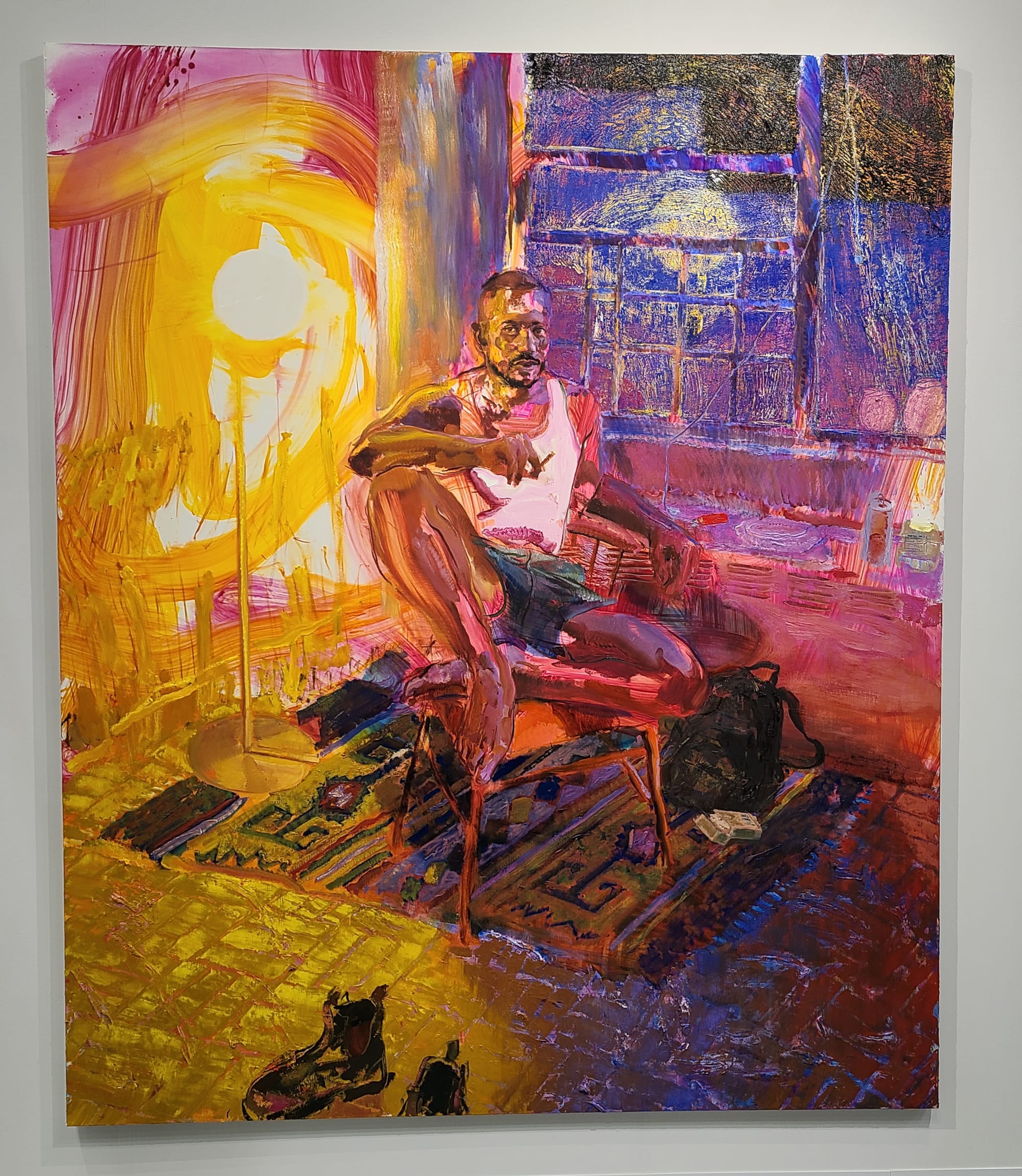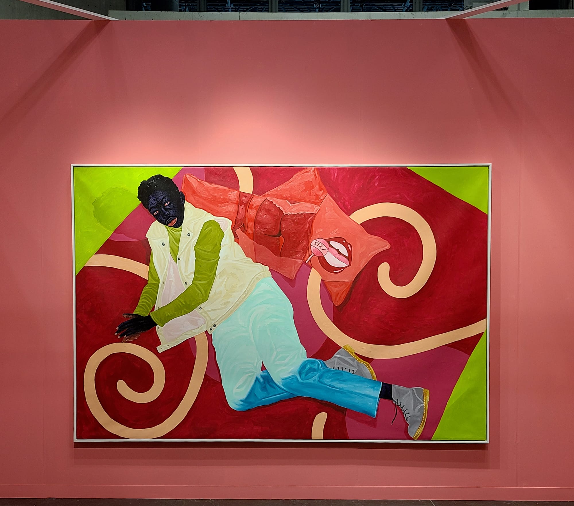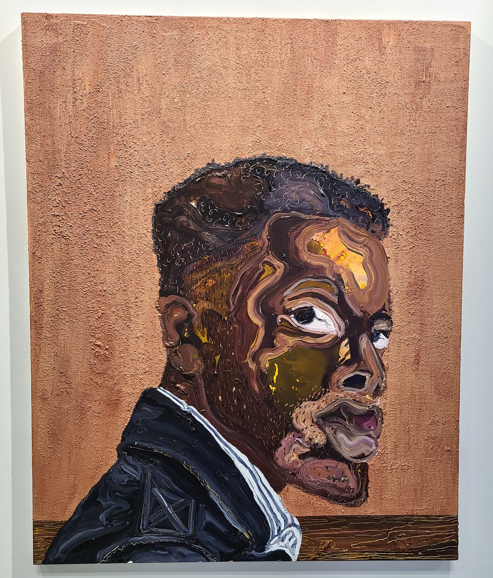 I also was introduced to new artists. Adrienne Elise Tarver's work was displayed by Ivy Jones, the director of Welancora gallery, a space I’ve visited a few times in the previous years because they have consistently strong shows. Frankly they deserve more attention than the gallery gets. Tarver's textile work is mainly colorful portraits of women that gorgeously intricate and move toward the mystical. Housing gallery showed some lovely heavily stylized portraiture paintings by Nathaniel Oliver that meld figure and ground. For the galleries outside the United States, I was pleasantly surprised by Kwesi Botchway’s work at Gallery 1957 in Accra, Ghana. His portraits of Black people all with mottled obsidian skin tones and a bright pink lower lip are sumptuous visual meals. And lastly the portrait “Suspect #5” (2021) by Ludovic Nkoth, at the booth for Luce gallery in Turin, Italy, made me pause, then stop and marvel at his facility with paint. The face is all swirls and textured surfaces that yet cohere into a person.