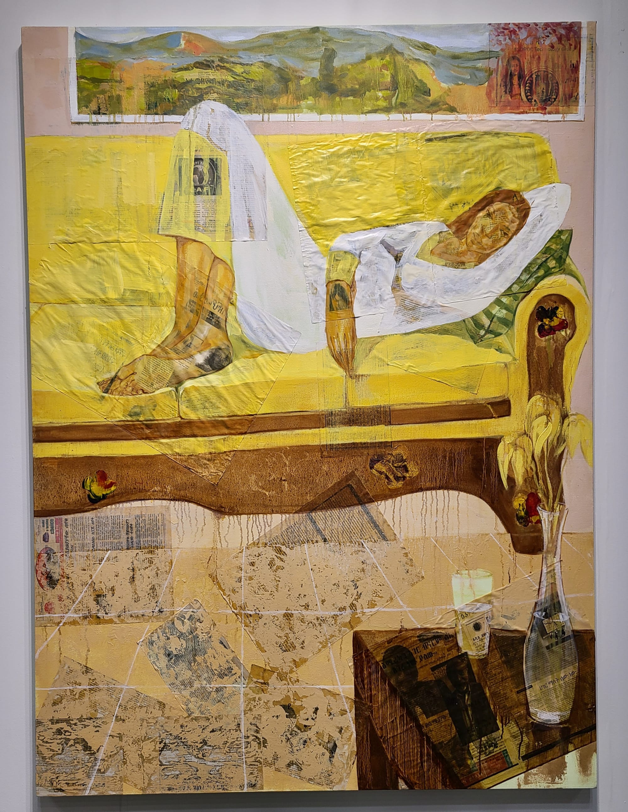 At Fridman Gallery, New York: Hana Yilma Godine, “Spaces Within Space (1)” (2019) oil, acrylic, collage on canvas, 70 x 54 inches