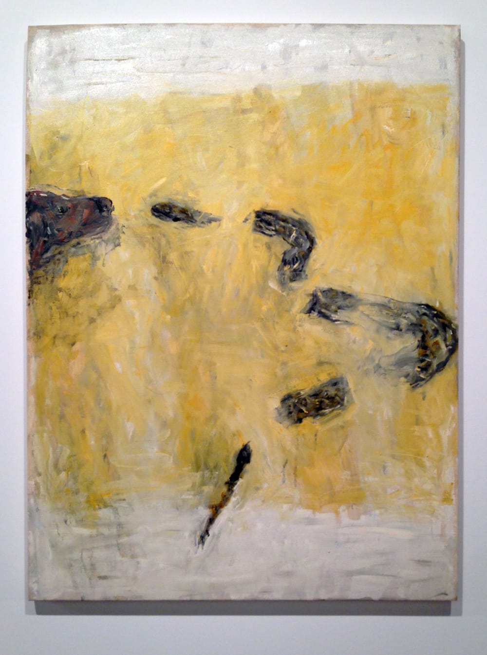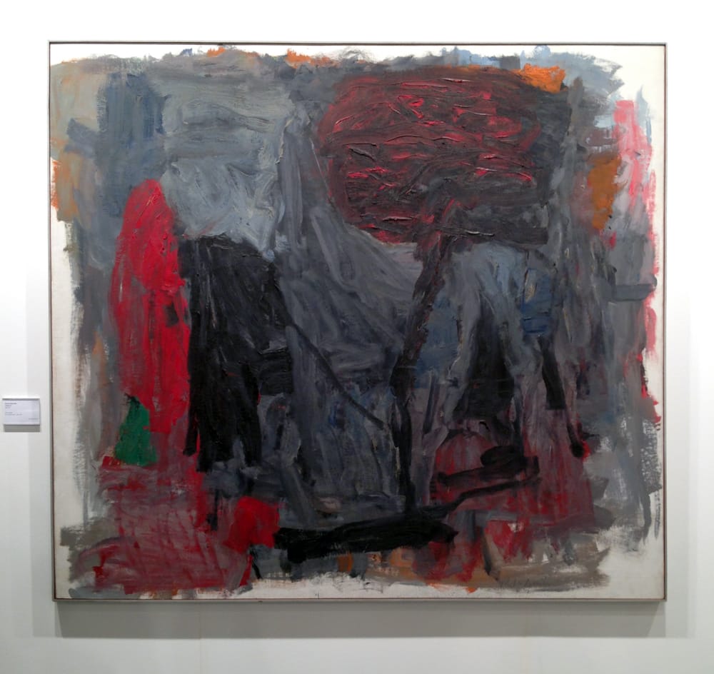 Discovery also extended to artists we thought we knew all too well: an oil on canvas by Philip Guston, “Traveler III” from 1959-60, was made ten years before his celebrated move from Abstract Expressionism to his late figurative style, but it displays a spirit more closely aligned with the latter’s nasty-funny images than with the twilit lyricism of his non-objective work: the color is harsher and darker, and a red-and-black tree-like form dominating the right half of the picture could be a precursor to the innumerable clouds of cigarette smoke he painted later on.